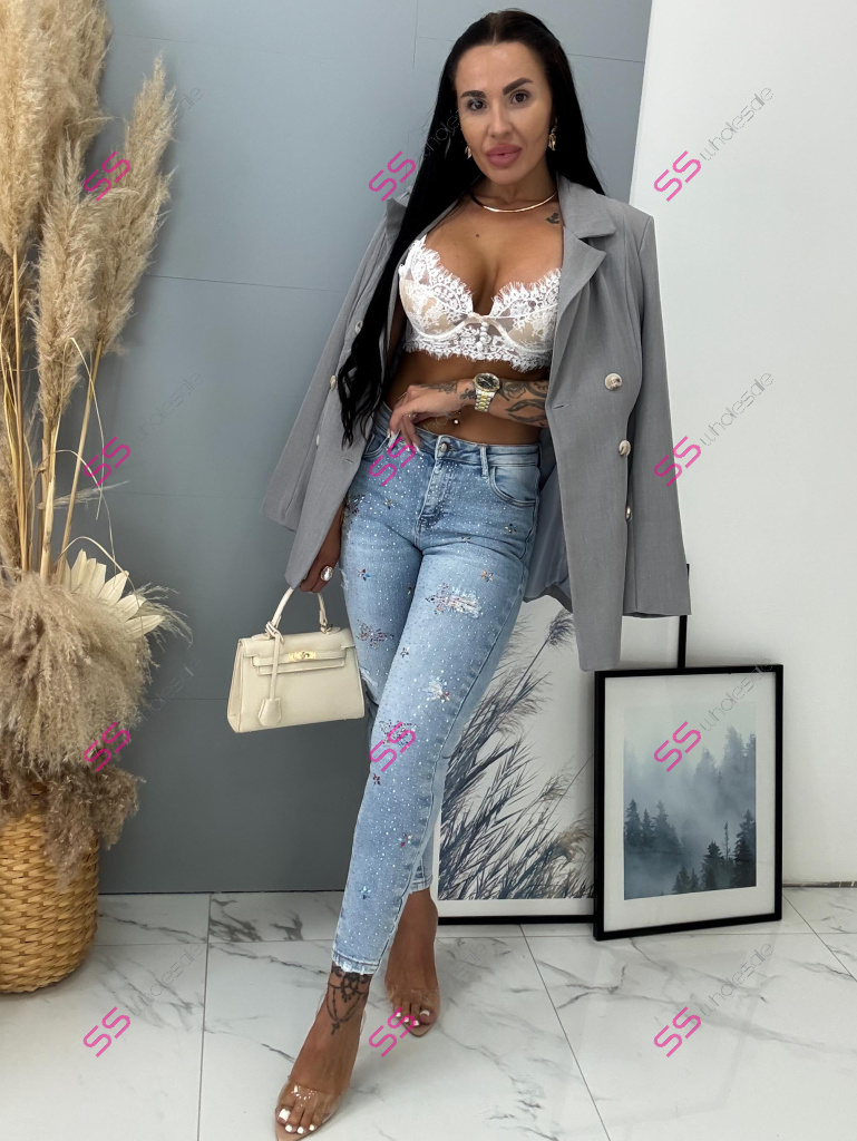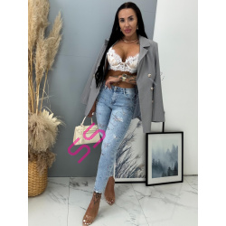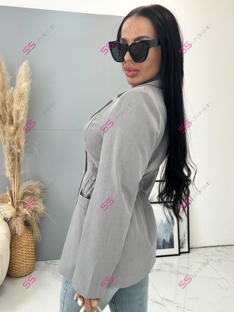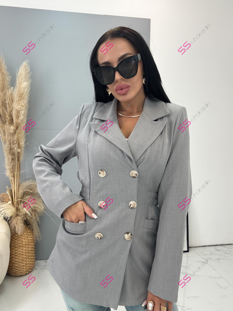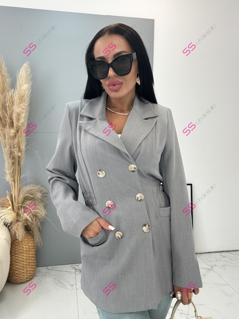 Dámske sako z príjemného materiálu. Materiál nie je elastický. Sako sa zapína na gombíky. Má vypchávky v oblasti ramien a gumu v páse. Je podšívané.