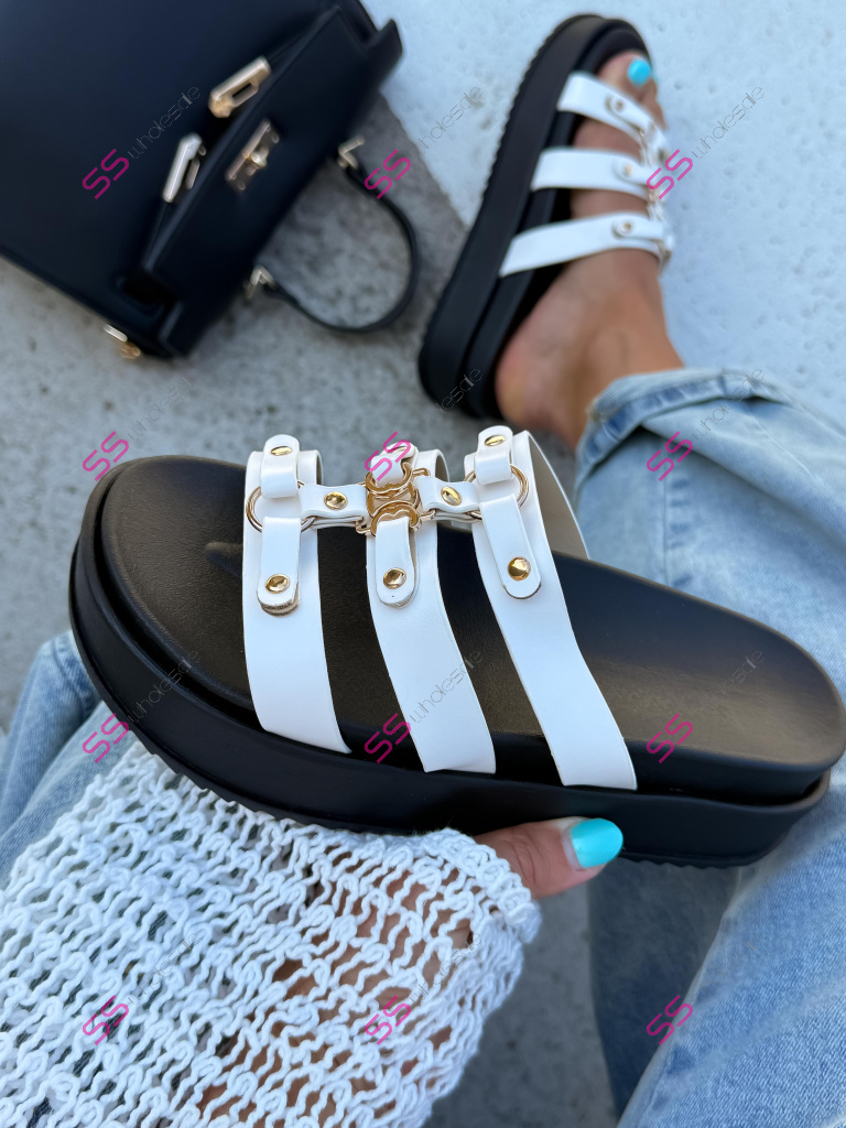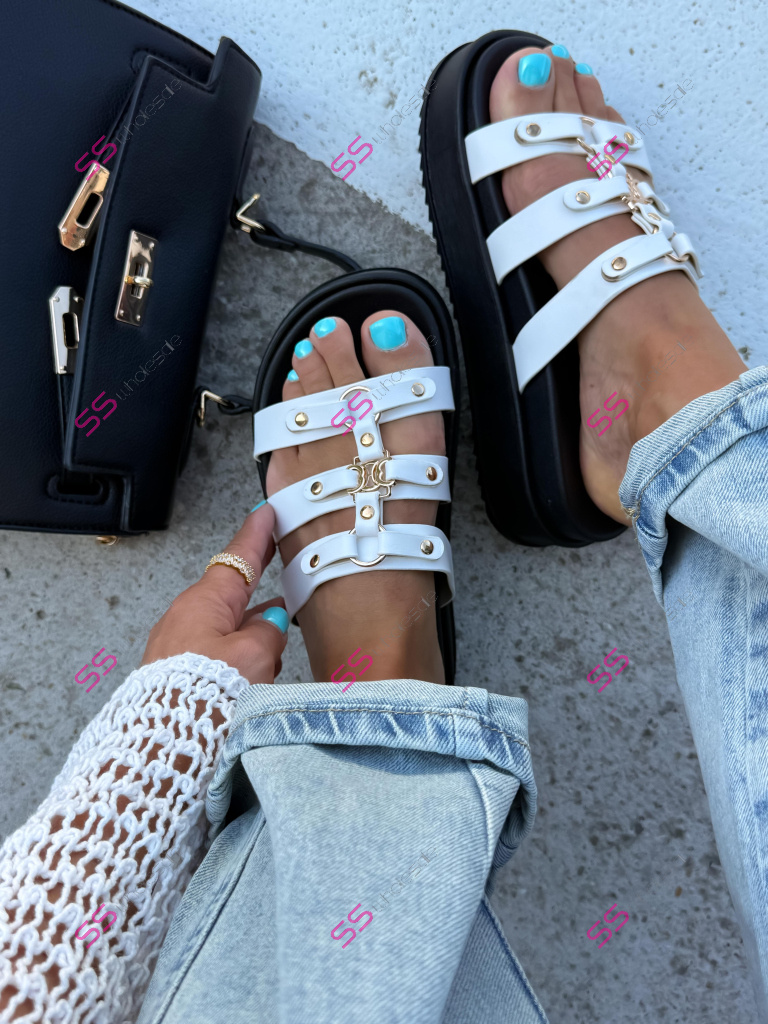 Dámske šľapky na každú príležitosť. Doplnky majú zlatú farbu.