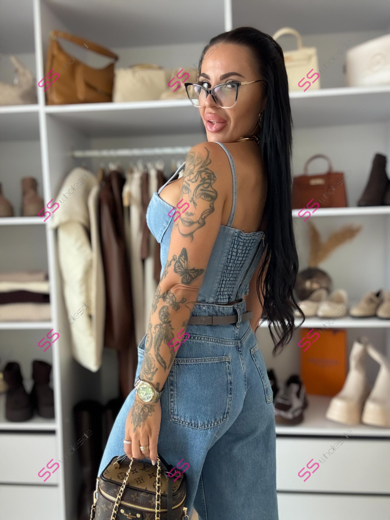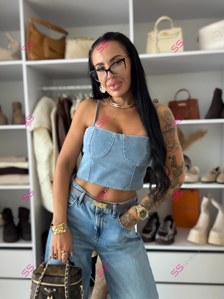 Modelka čiernovláska meria 164 cm a váži 57 kg. má na sebe veľkosť S/M
