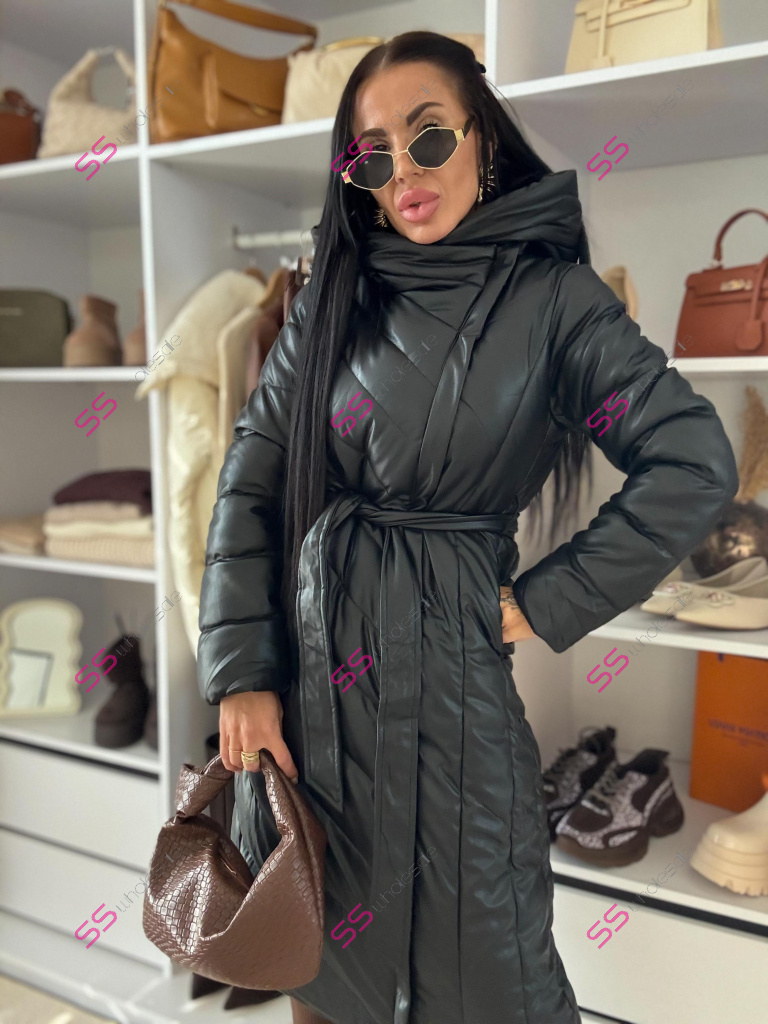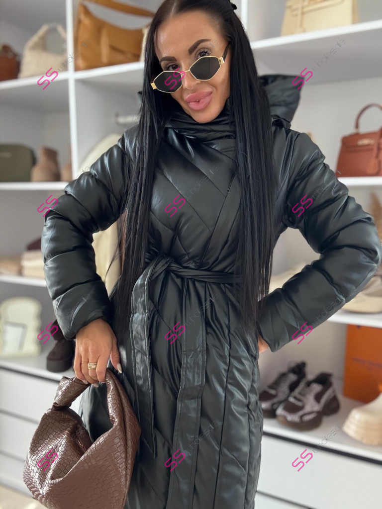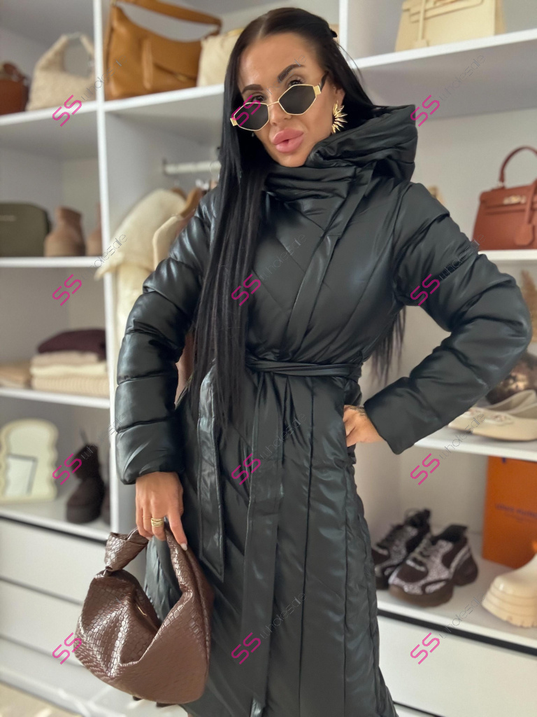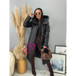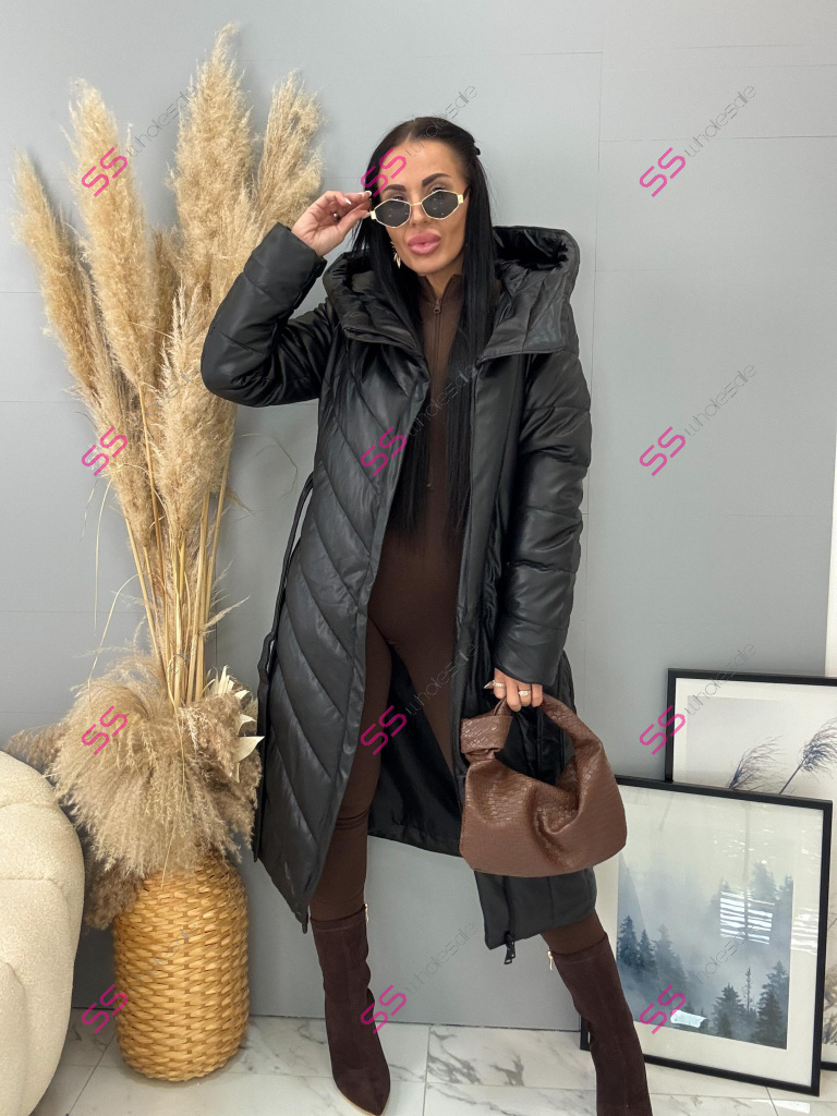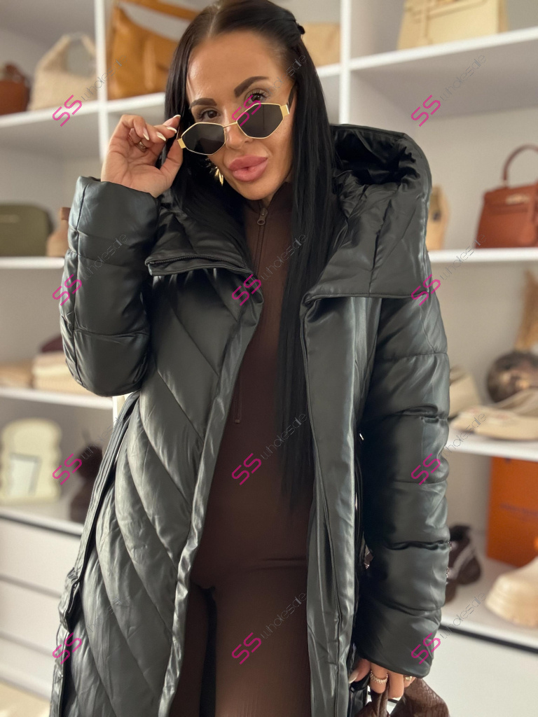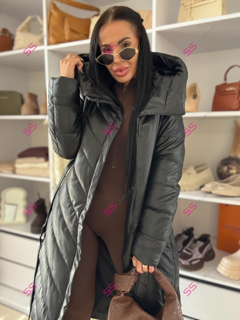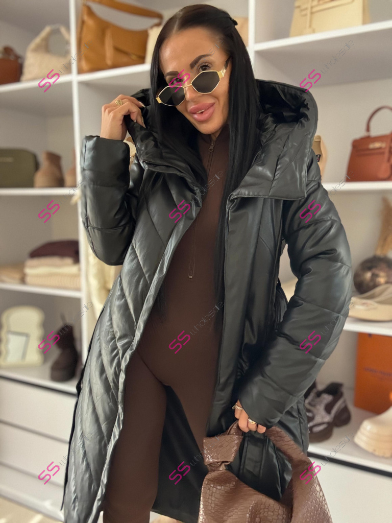Dlhý koženkový kabát s kapucňou a opaskom JAMEA