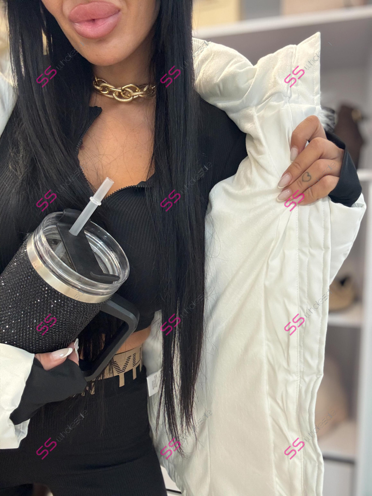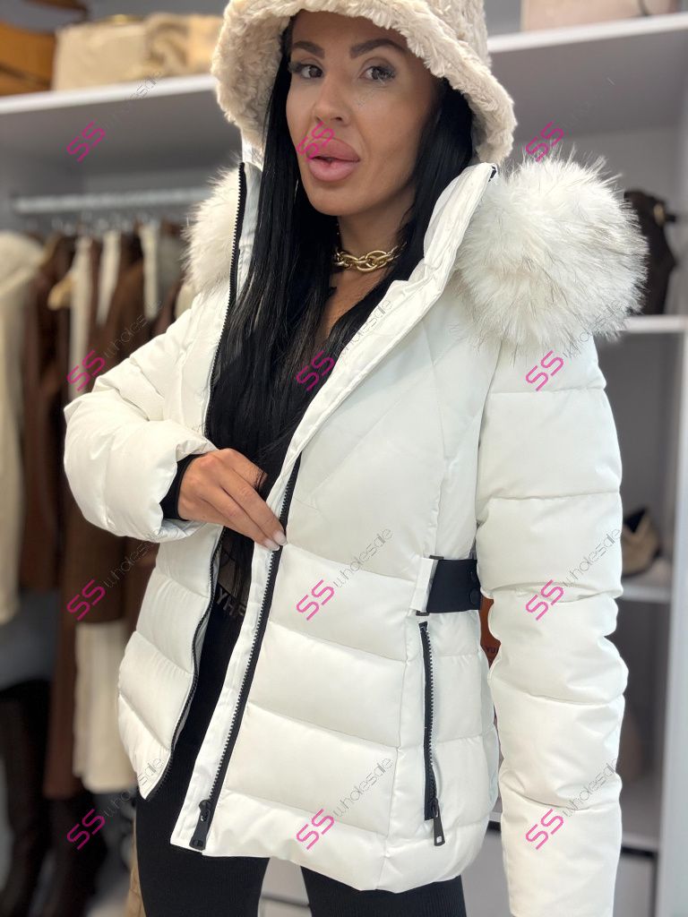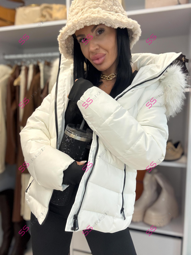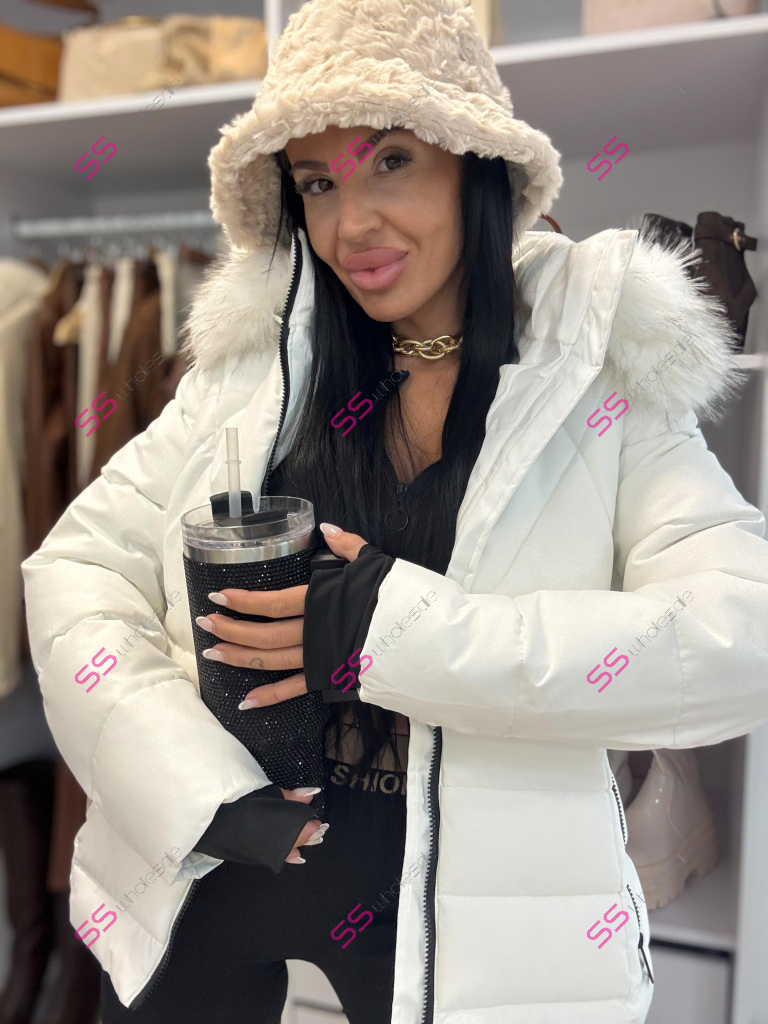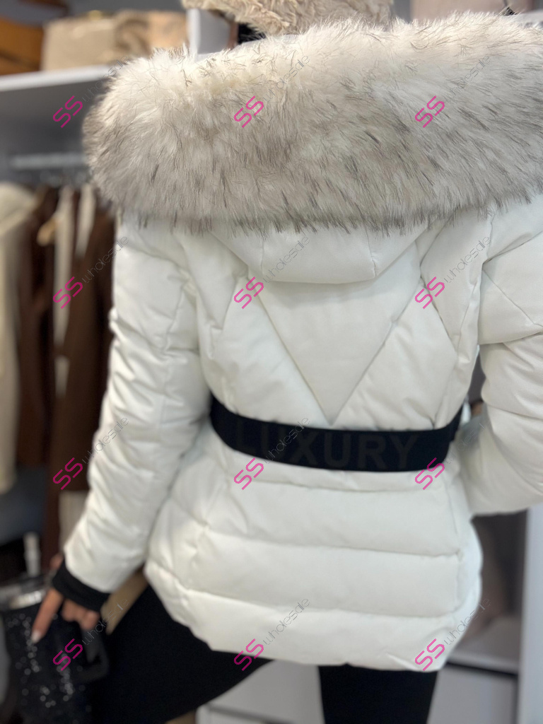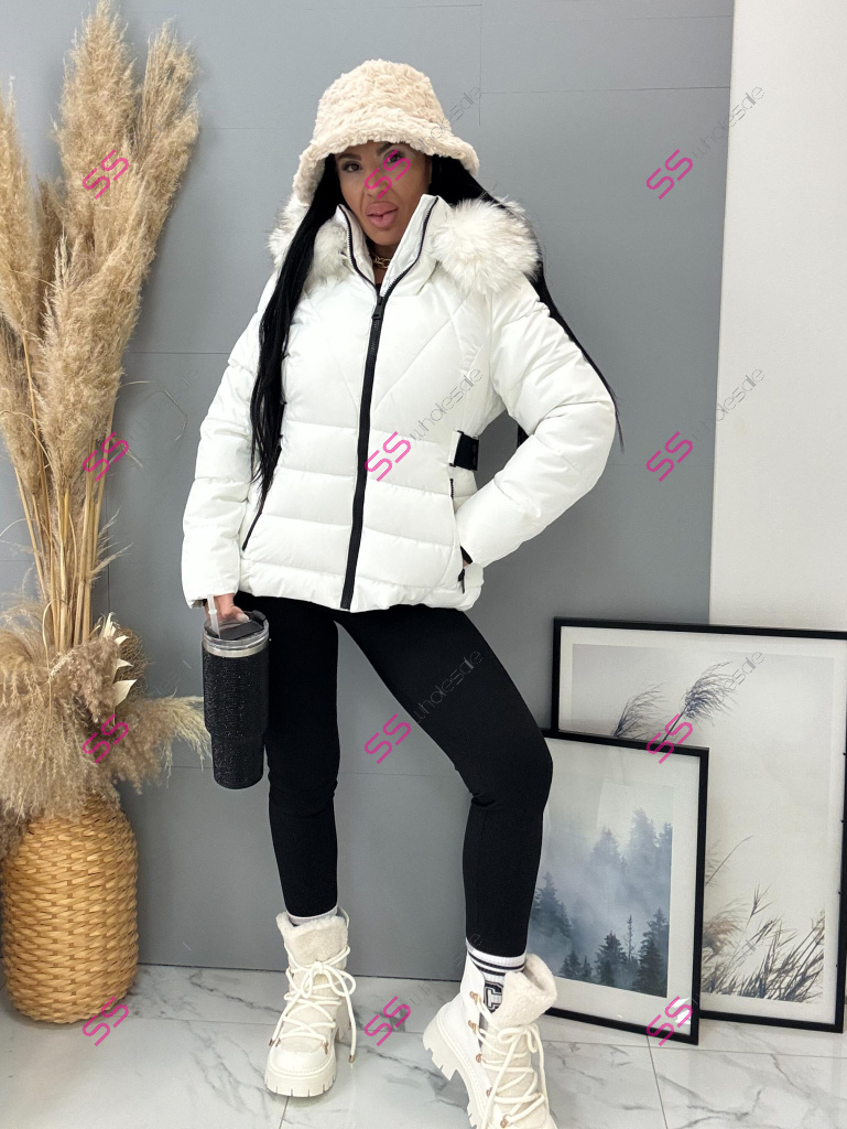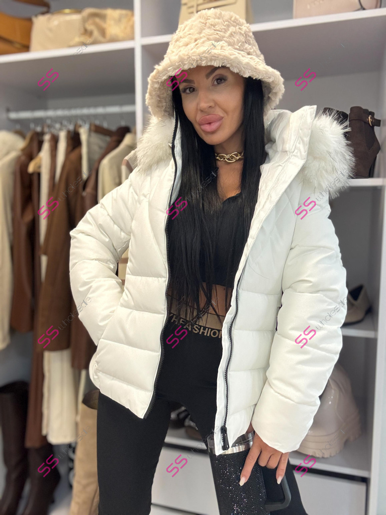 Bunda s odnímateľným kožušinovým lemom na golieri. S odnimateľnou kapucňou. S bočnými vreckami. Ozdoba v čiernej farbe.