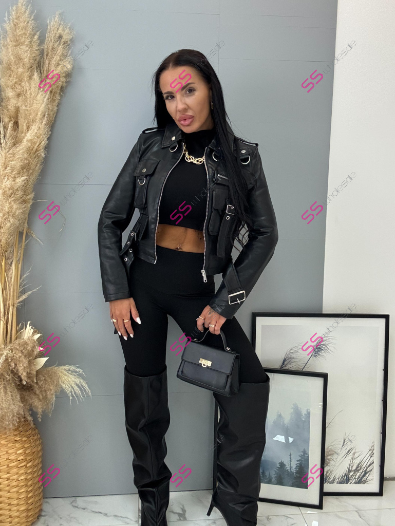 Krátka koženková bunda. Vpredu má funkčné vrecká. Detaily sú v stribornej farbe.