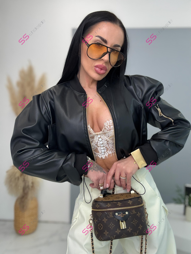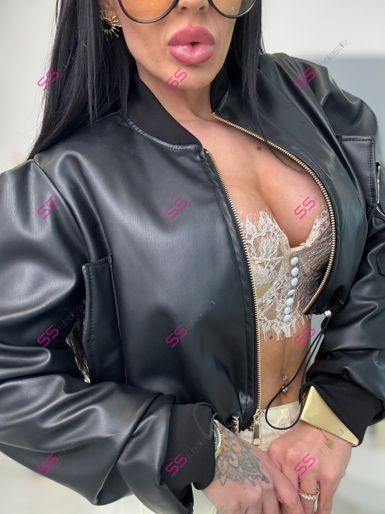 Krátka koženková bunda. Zips je zlatej farby. Spodnú časť bundy je možné natiahnúť.
