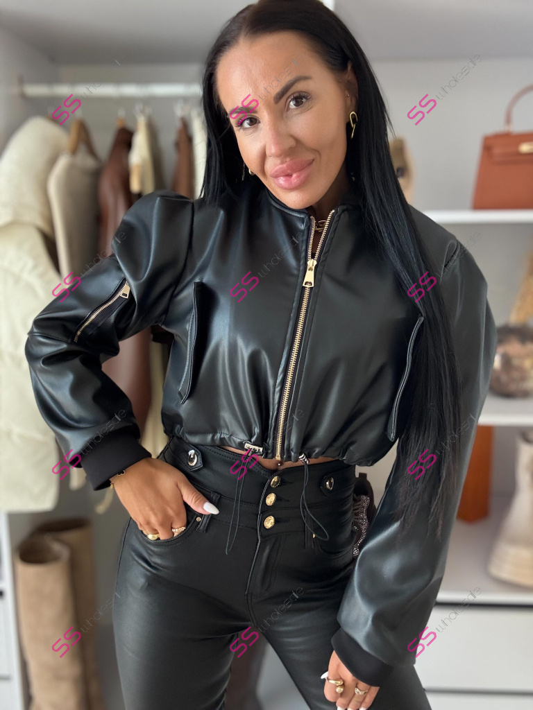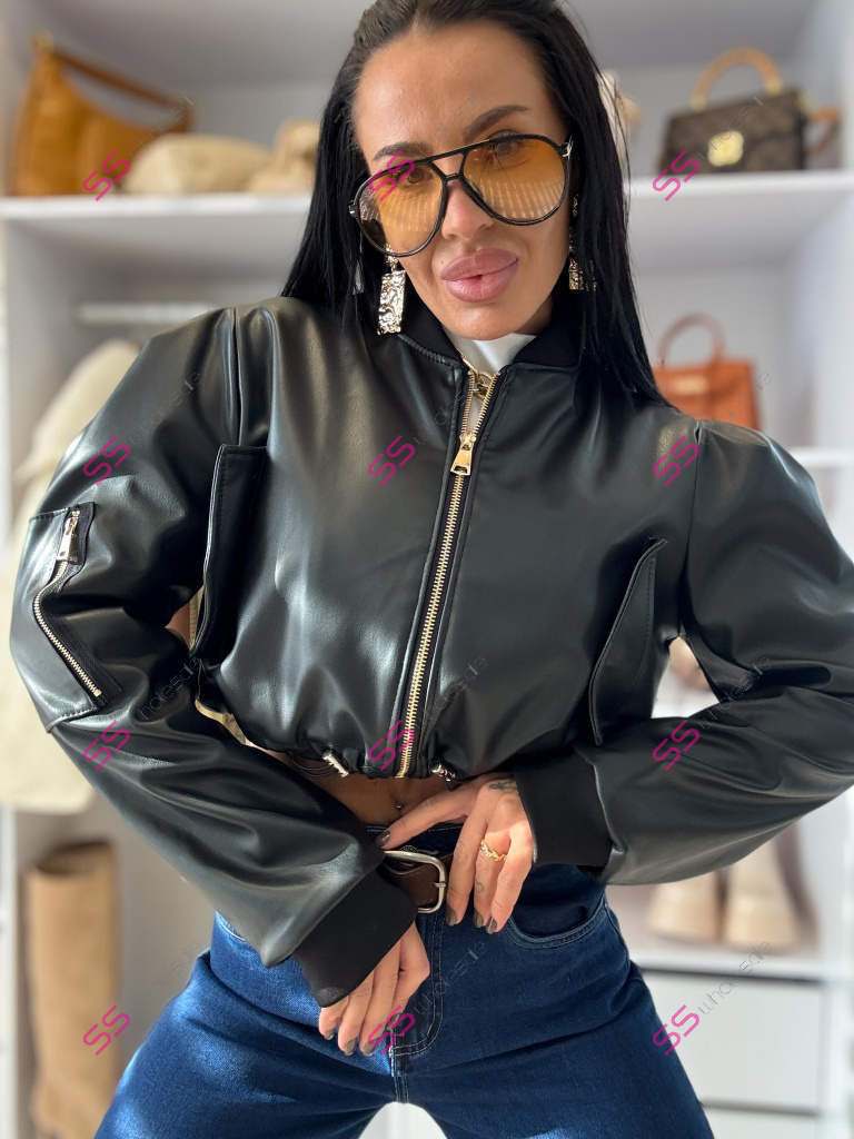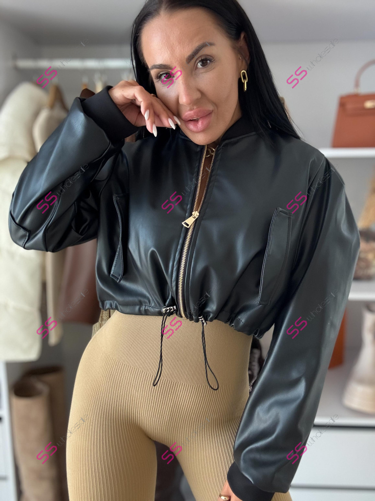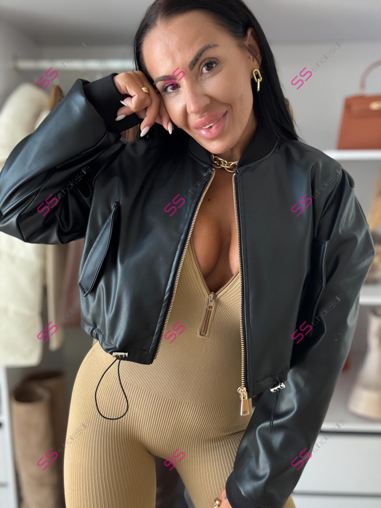 Krátka koženková bunda. Zips je zlatej farby. Spodnú časť bundy je možné natiahnúť.