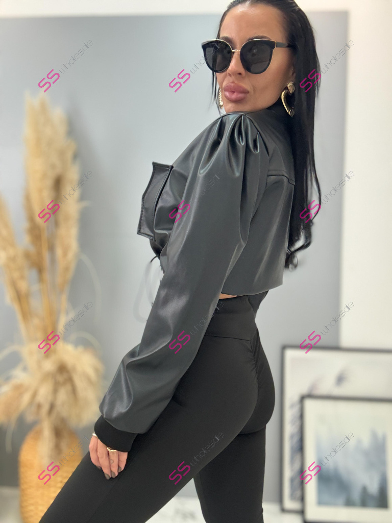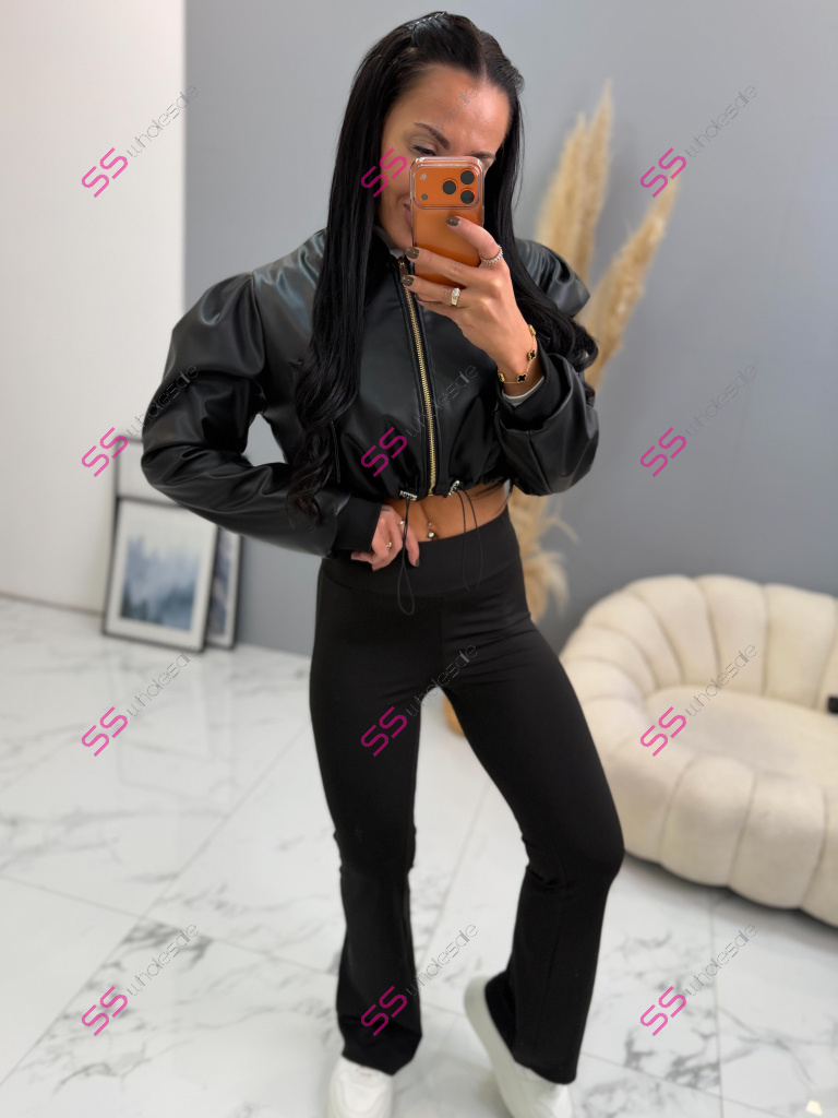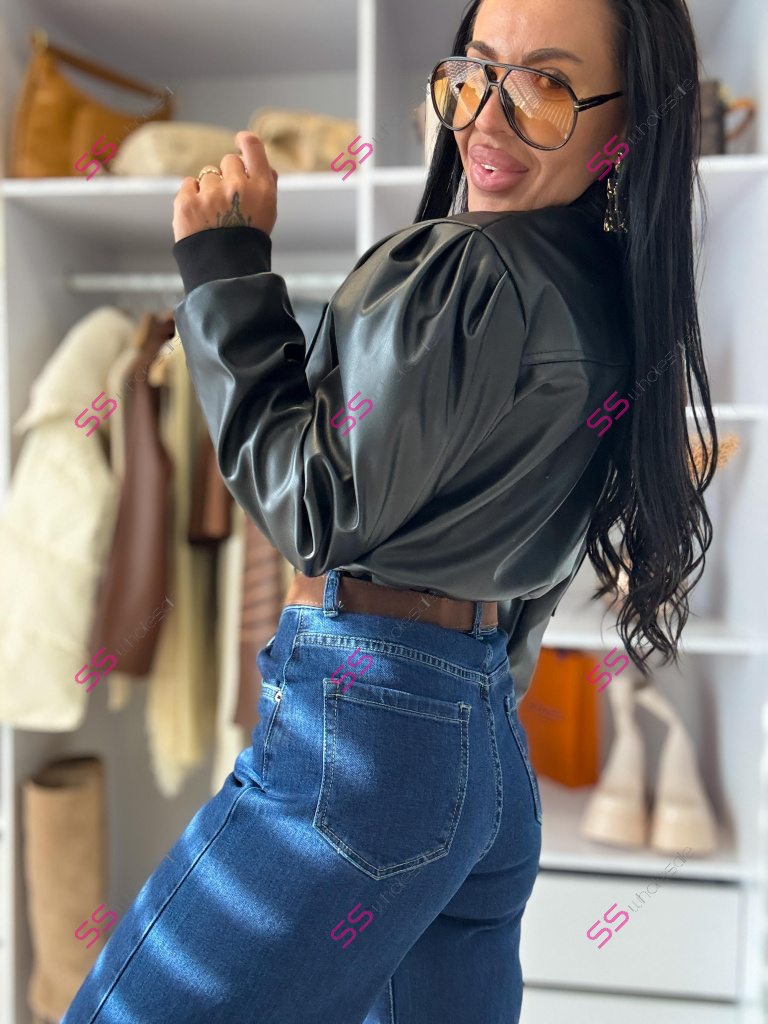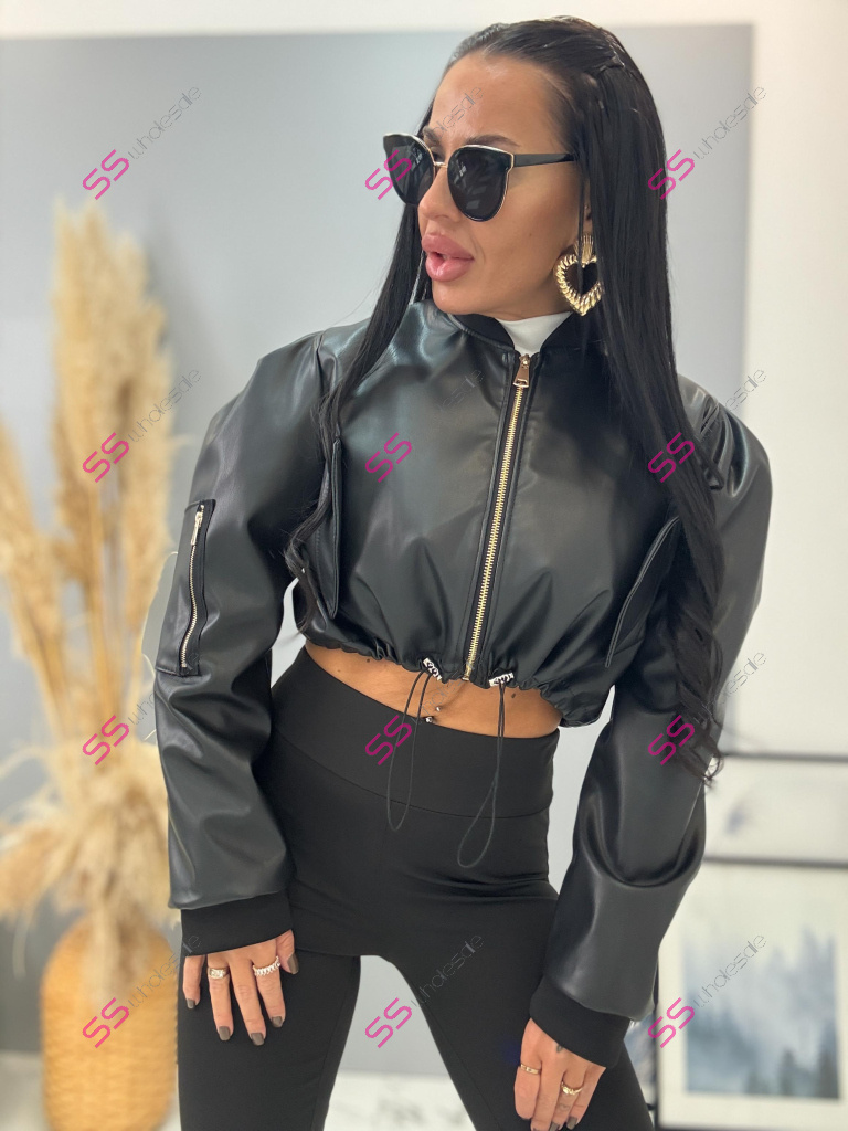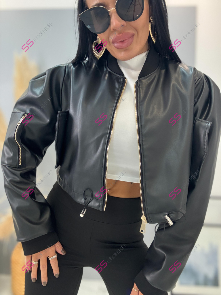 Krátka koženková bunda. Zips je zlatej farby. Spodnú časť bundy je možné natiahnúť.
