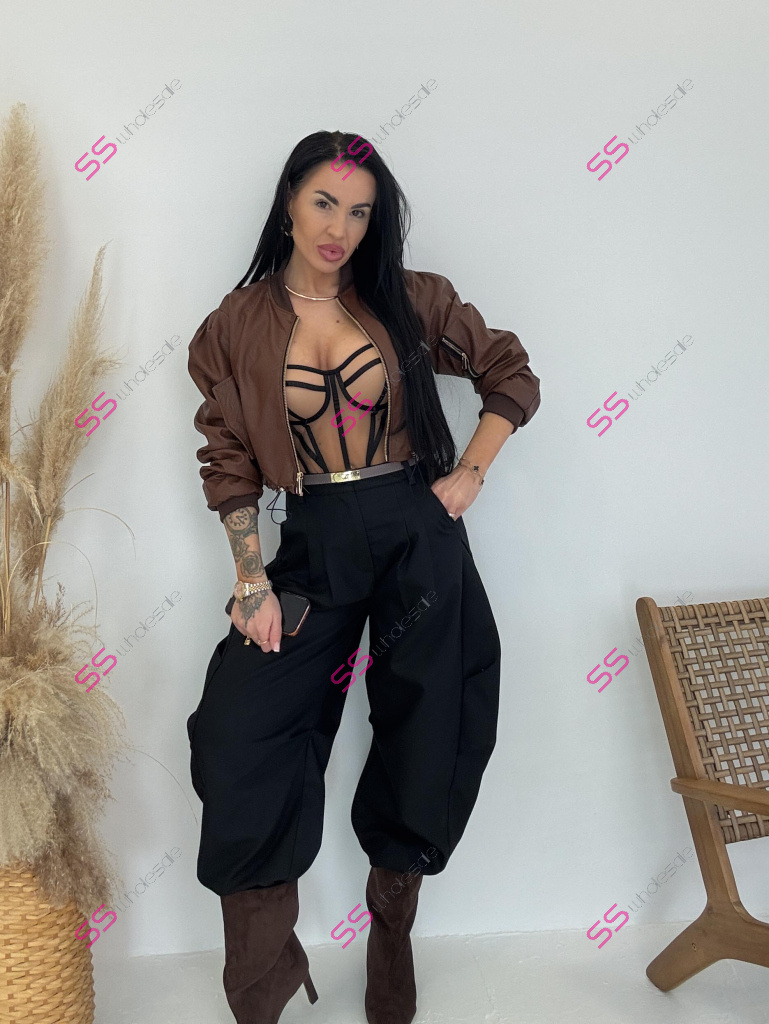 Krátka koženková bunda. Zips je zlatej farby. Spodnú časť bundy je možné natiahnúť.