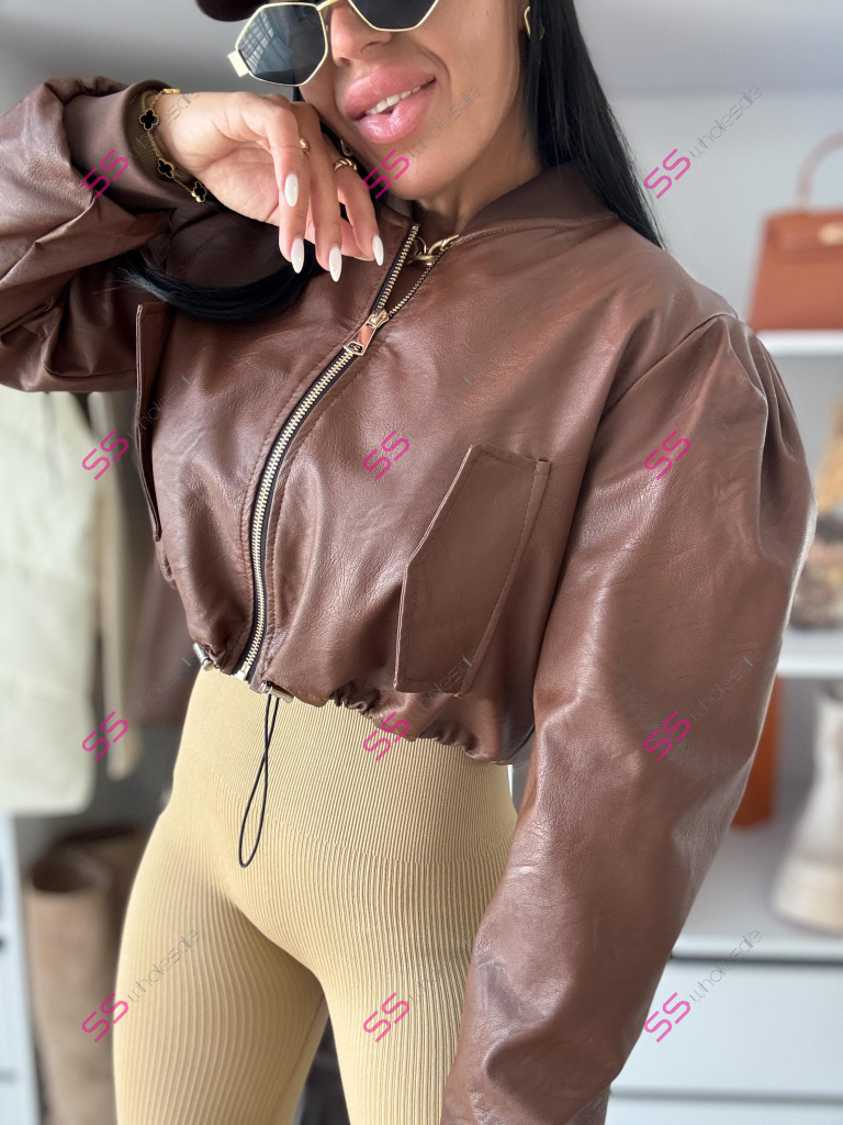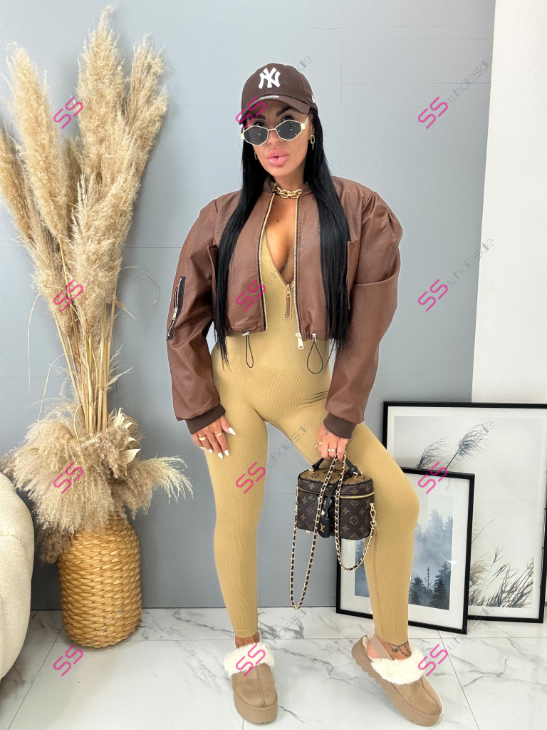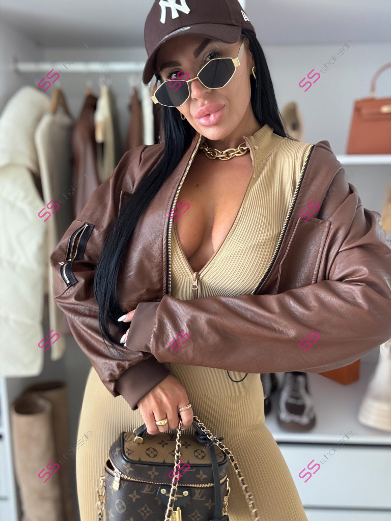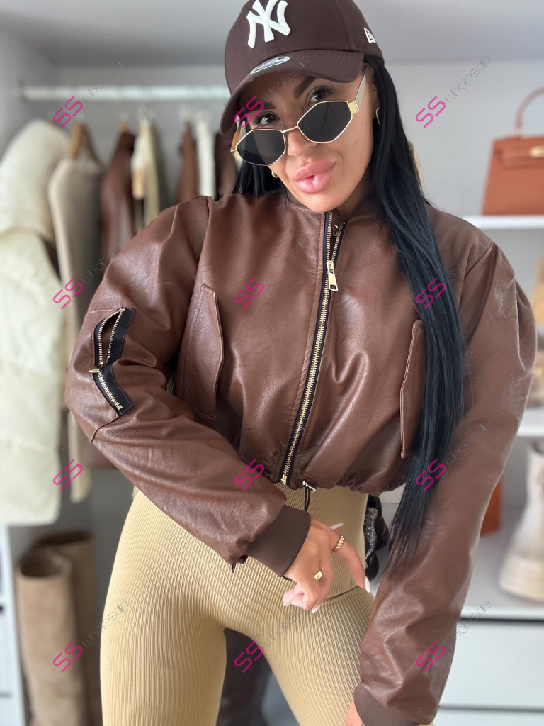 Krátka koženková bunda. Zips je zlatej farby. Spodnú časť bundy je možné natiahnúť.