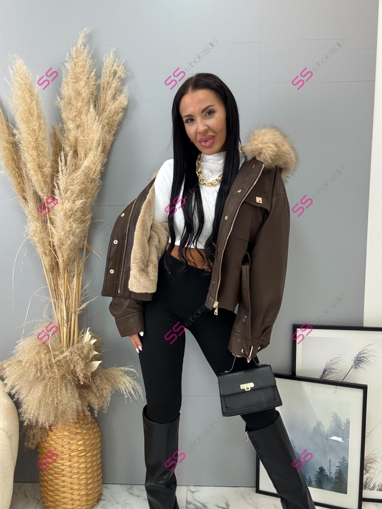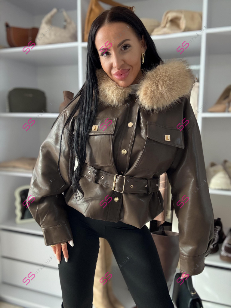 Kožená bunda s odnímateľným kožušinovým lemom na golieri. Podšitý mäkkým, príjemným kožúškom. Detaily sú v zlatej farbe. S vreckami v prednej časti. S opaskom.