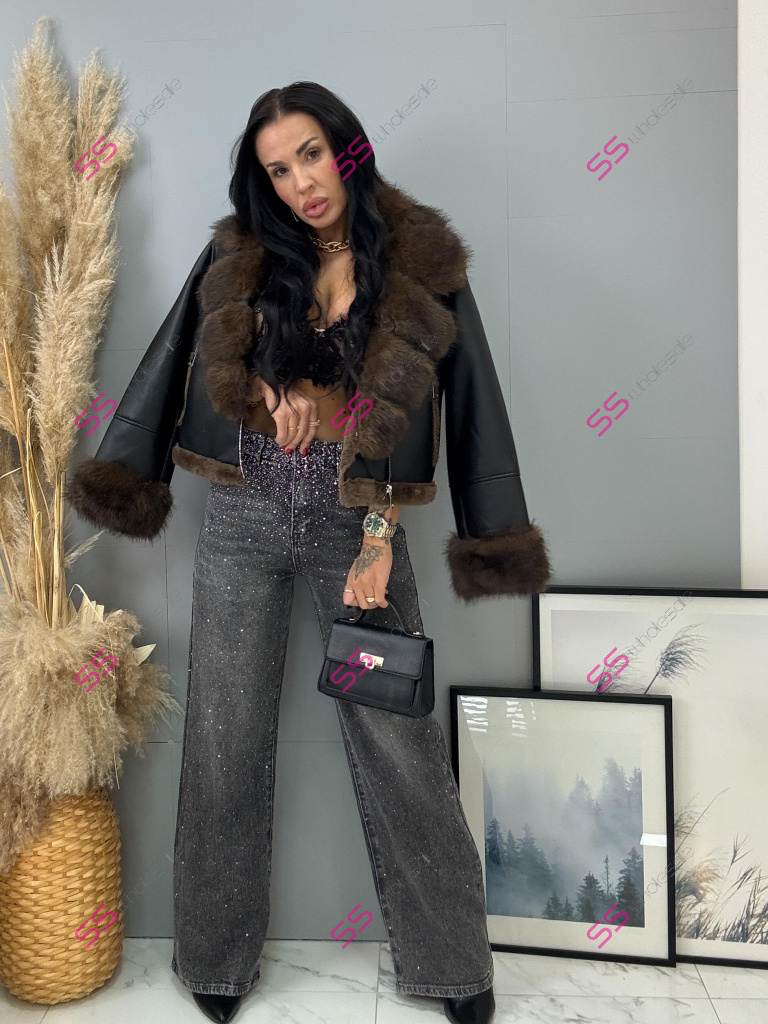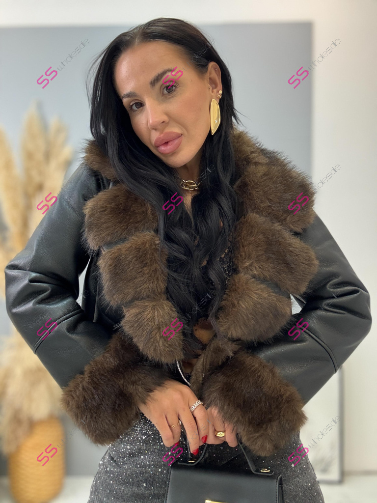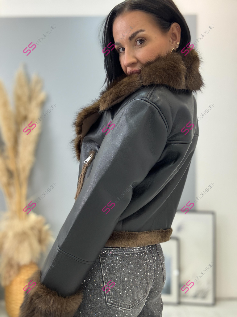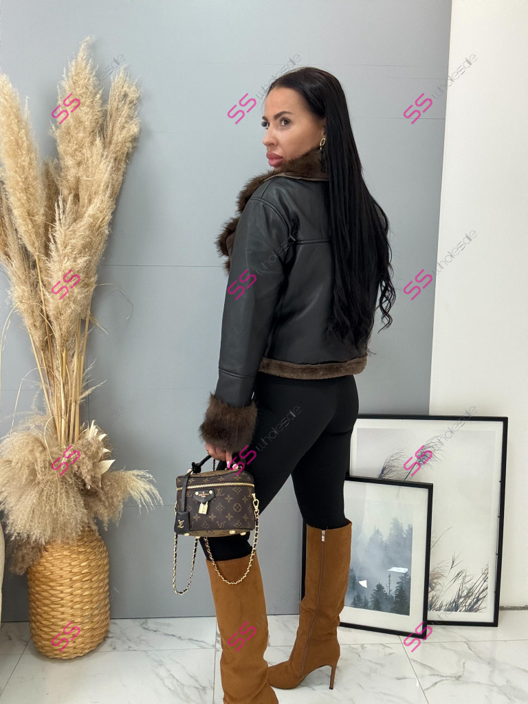 Kožená bunda s neodnímateľným kožušinovým lemom na golieri a rukávoch. Podšitý mäkkým, príjemným kožúškom. Detaily sú v stribornej farbe. S bočnými vreckami.
