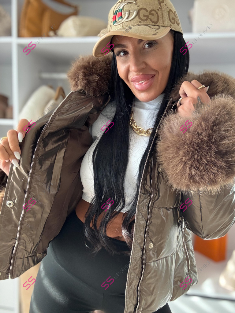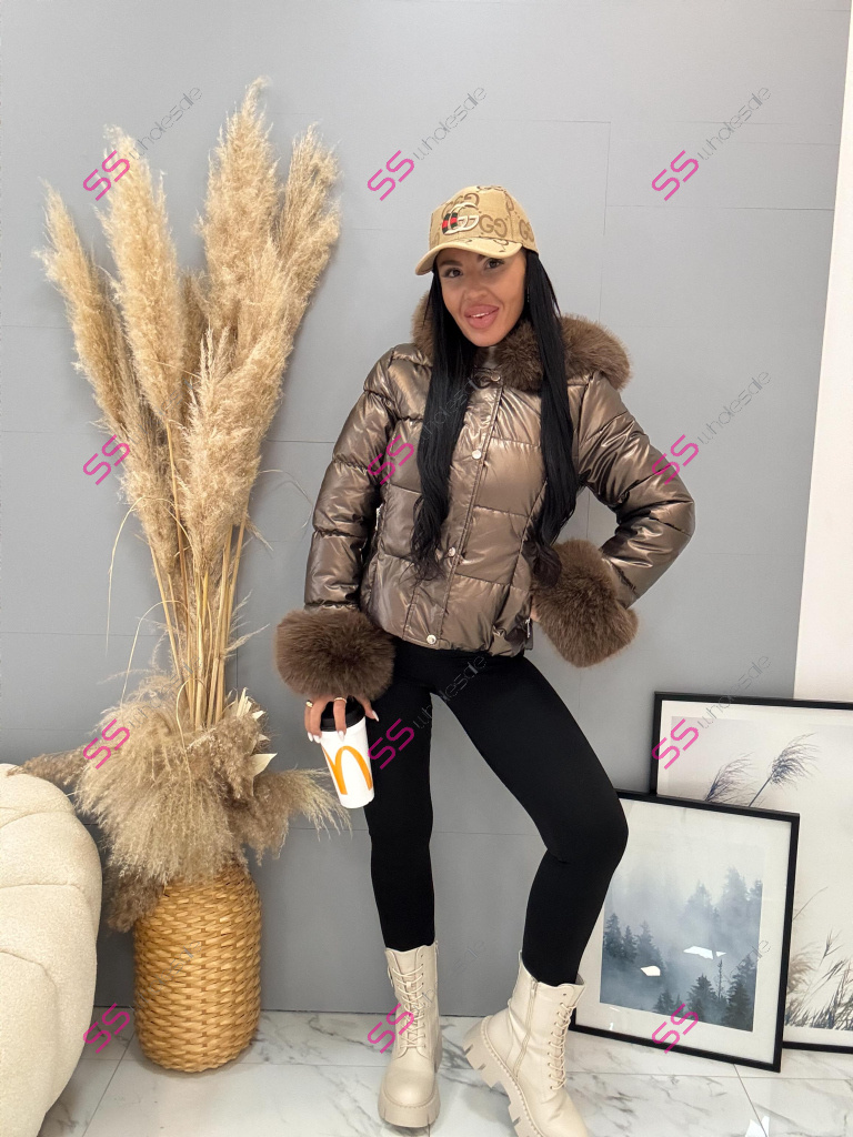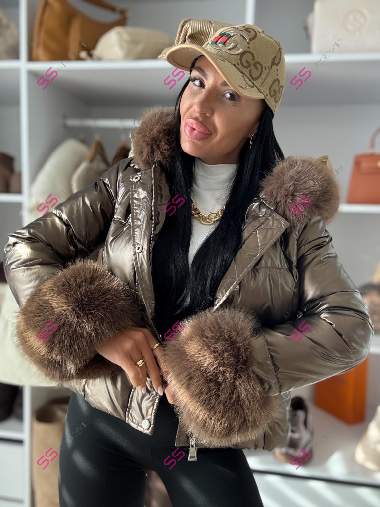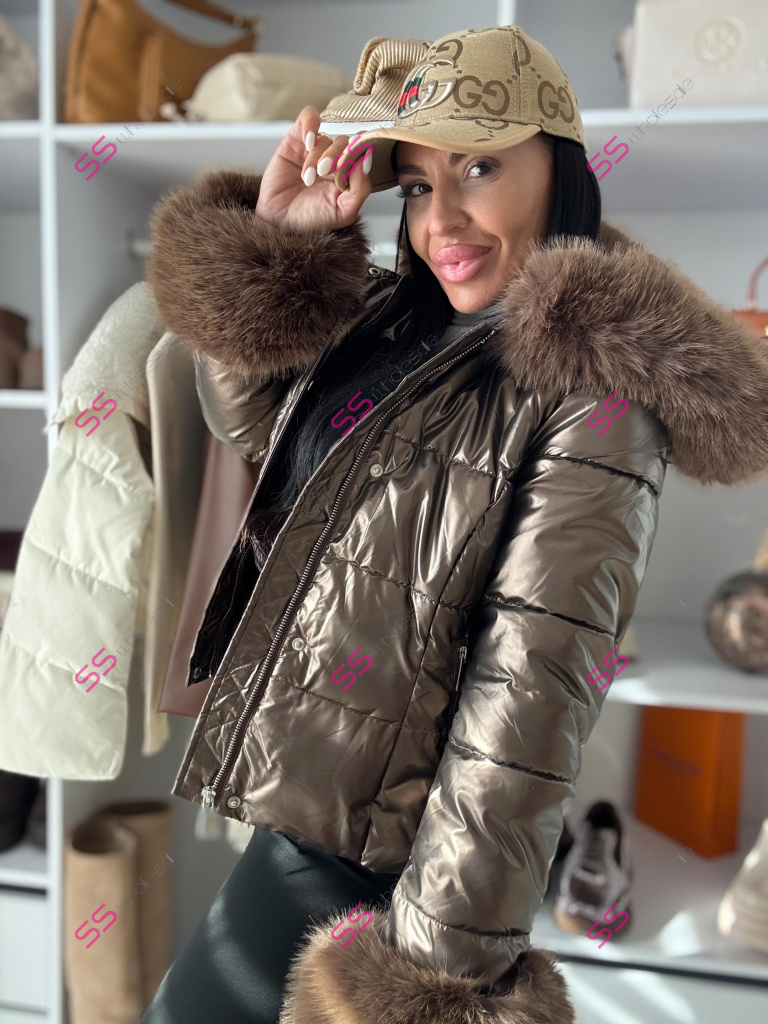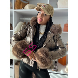 Materiál nie je elastický.Kabát sa zapína na zips a cvoky. Kapucňa je neodnímateľná. S odnímateľným kožušinovým lemom na golieri a rukávoch. Ozdoby sú strieborné.