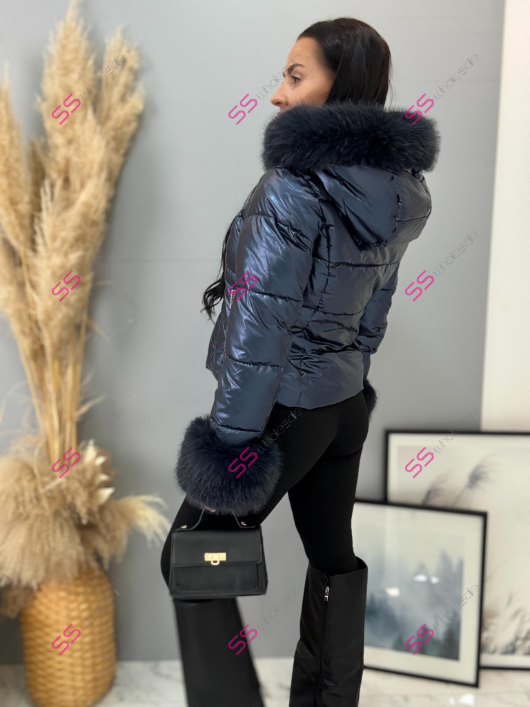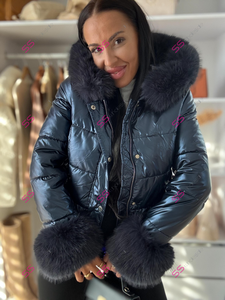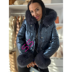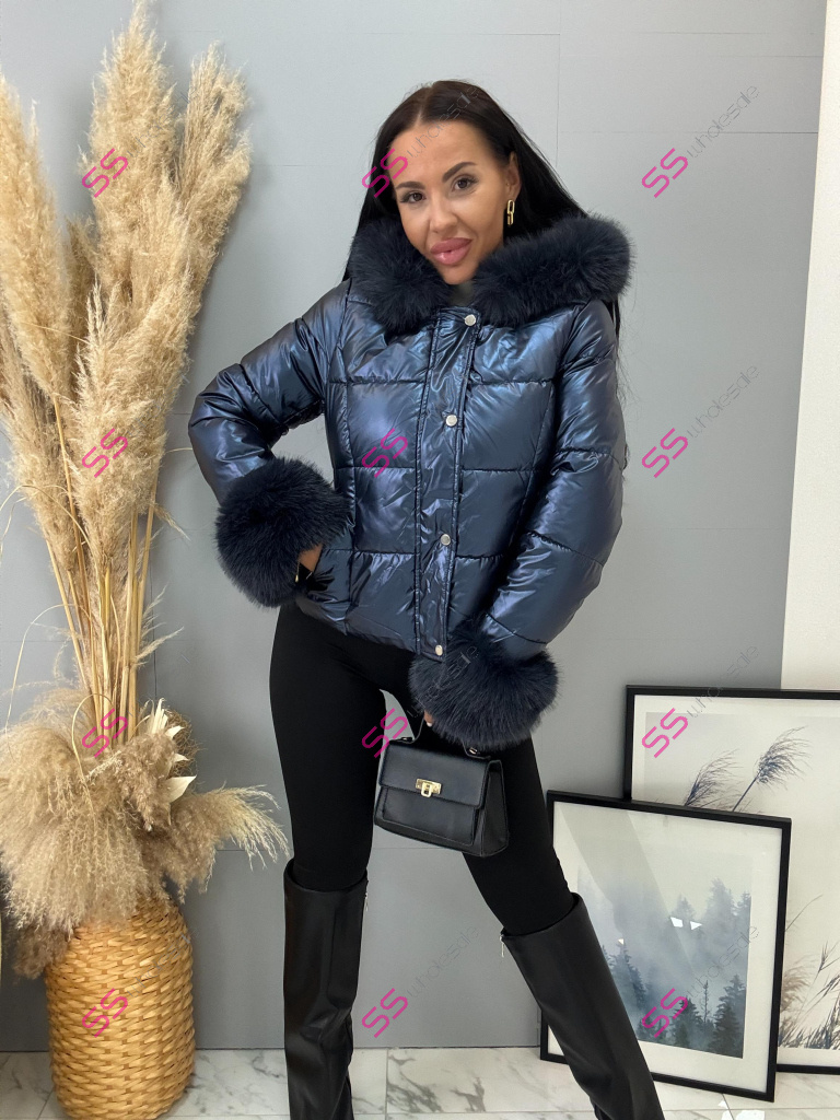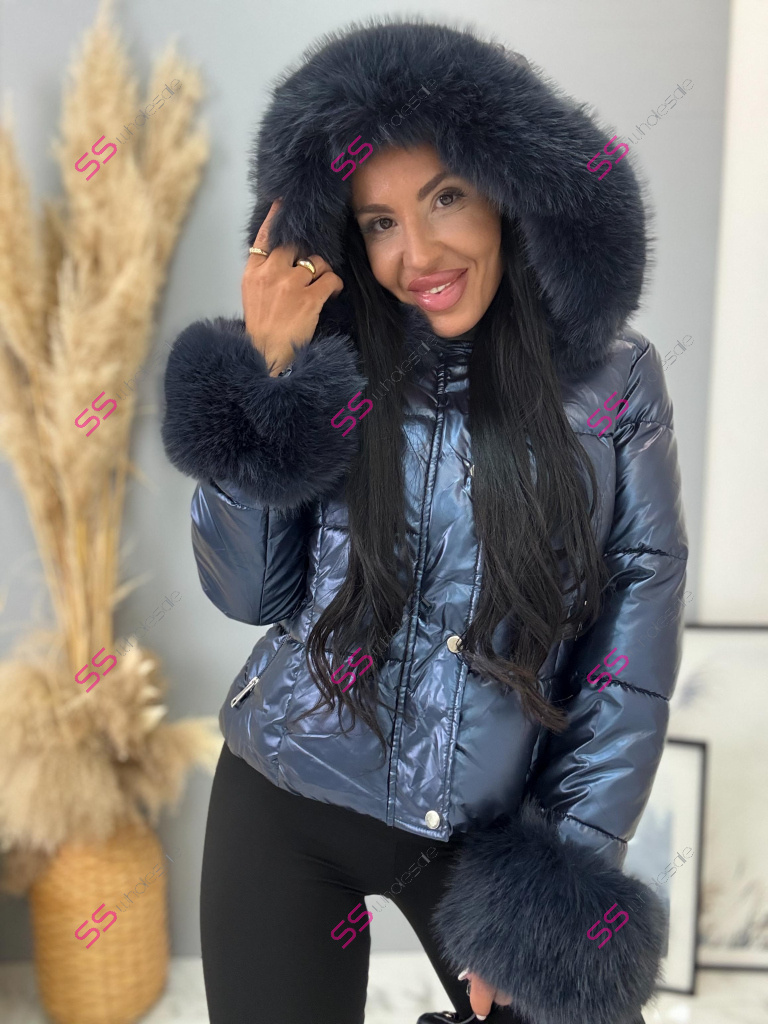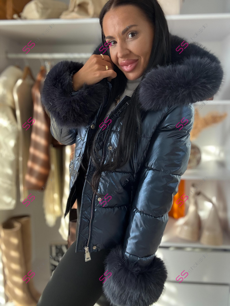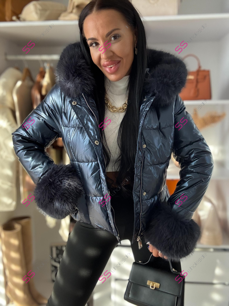 Materiál nie je elastický.Kabát sa zapína na zips a cvoky. Kapucňa je neodnímateľná. S odnímateľným kožušinovým lemom na golieri a rukávoch. Ozdoby sú strieborné.