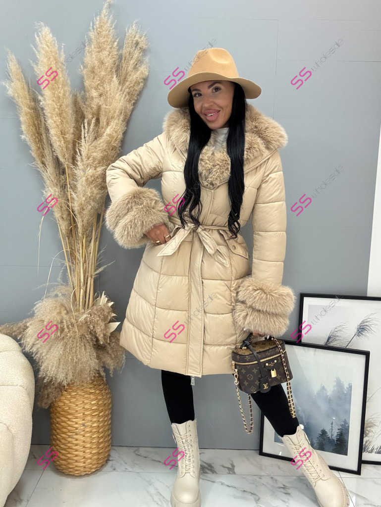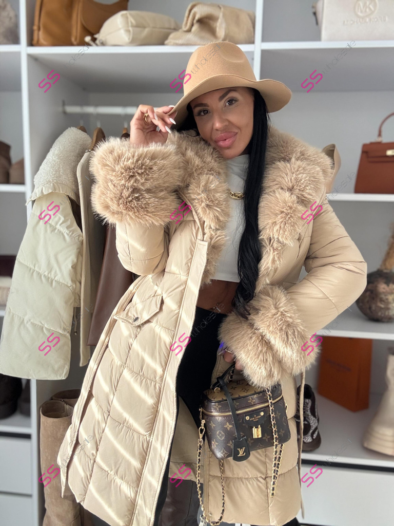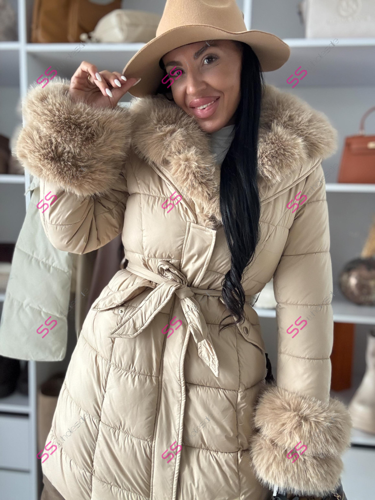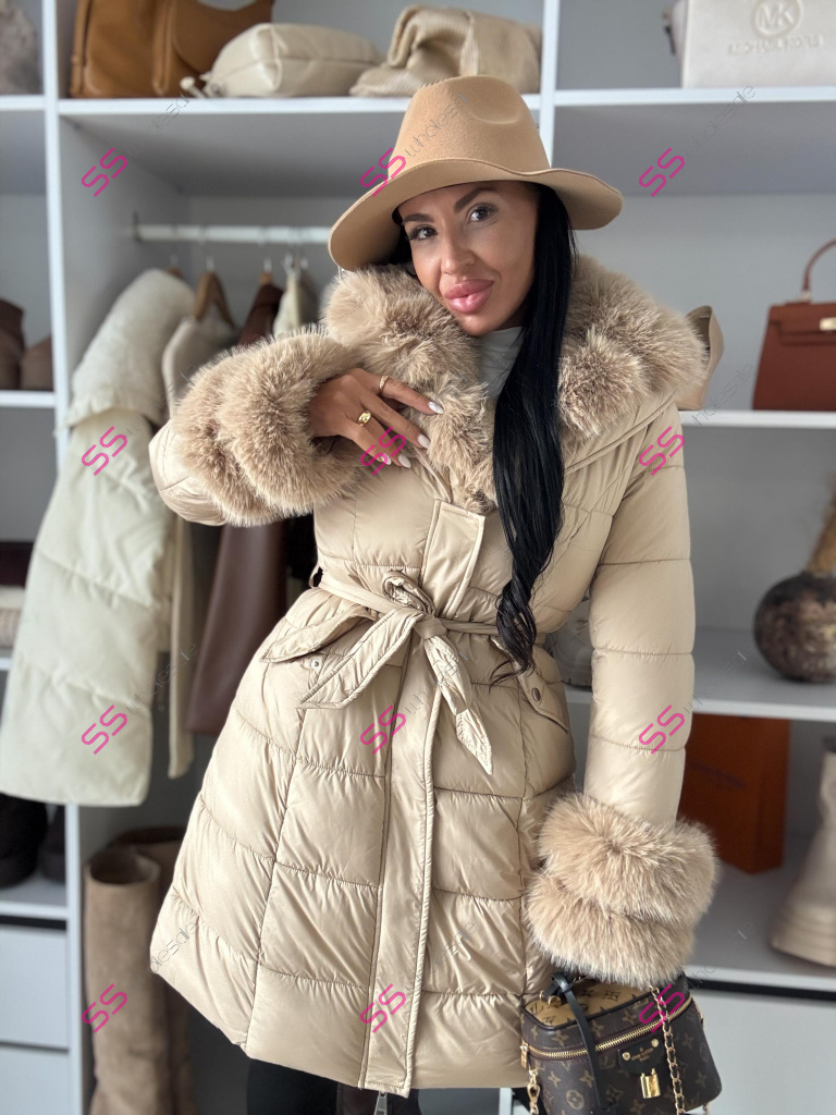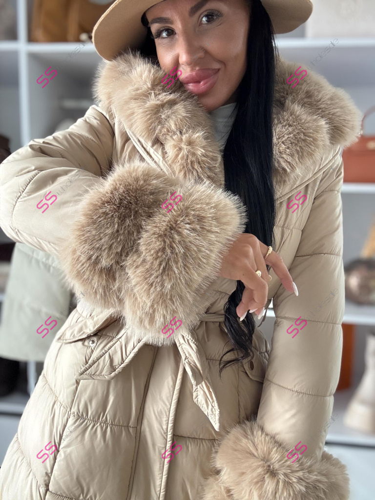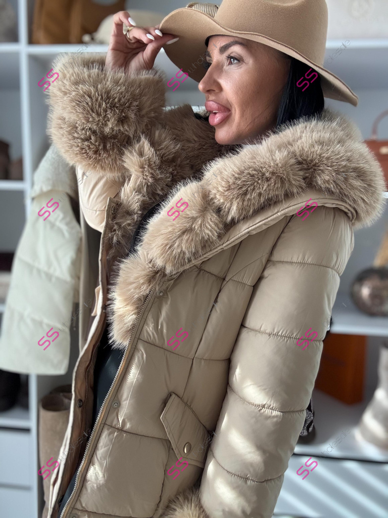 Bunda s odnímateľným kožušinovým lemom na golieri. S bočnými vreckami. Ozdoba v striebornej farbe.
