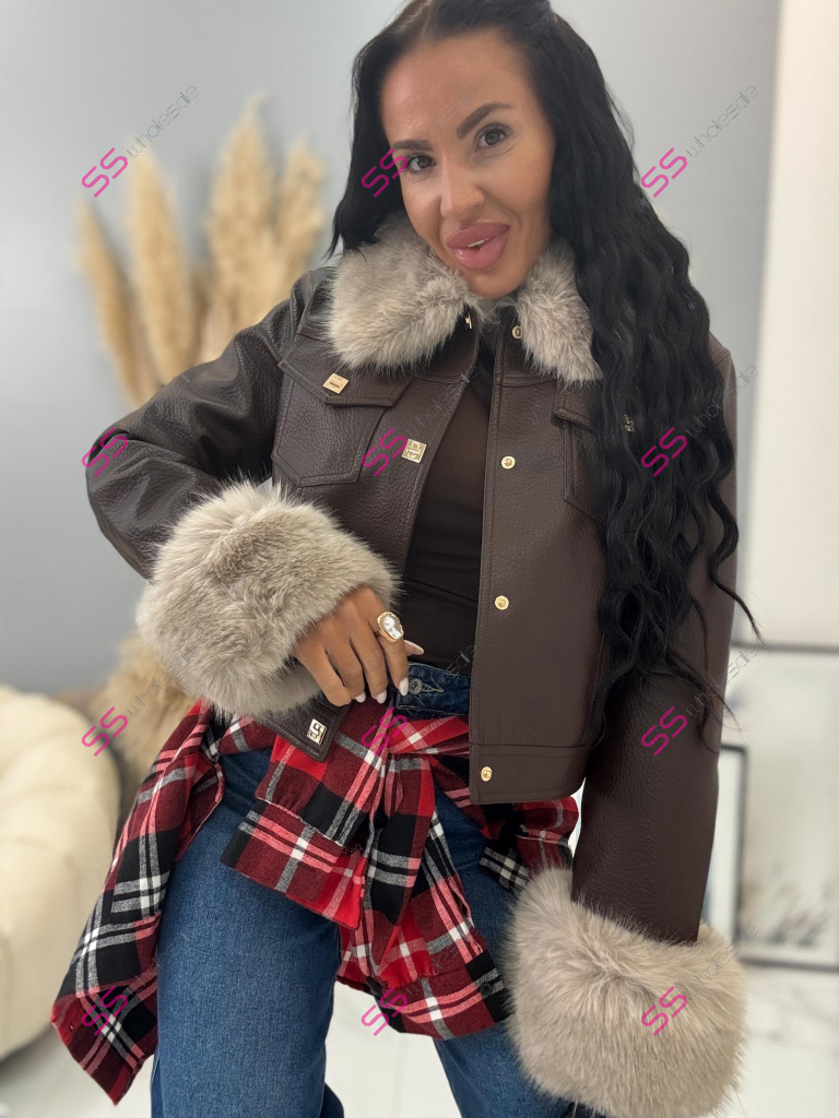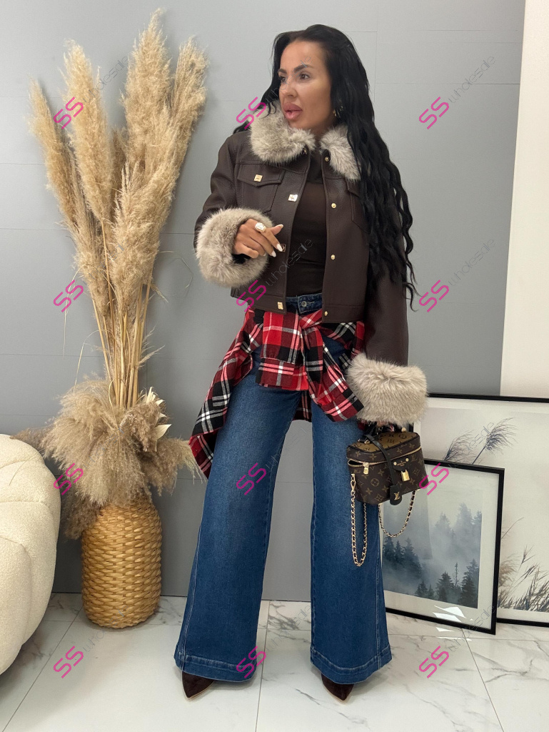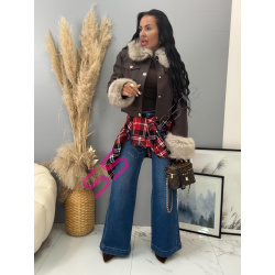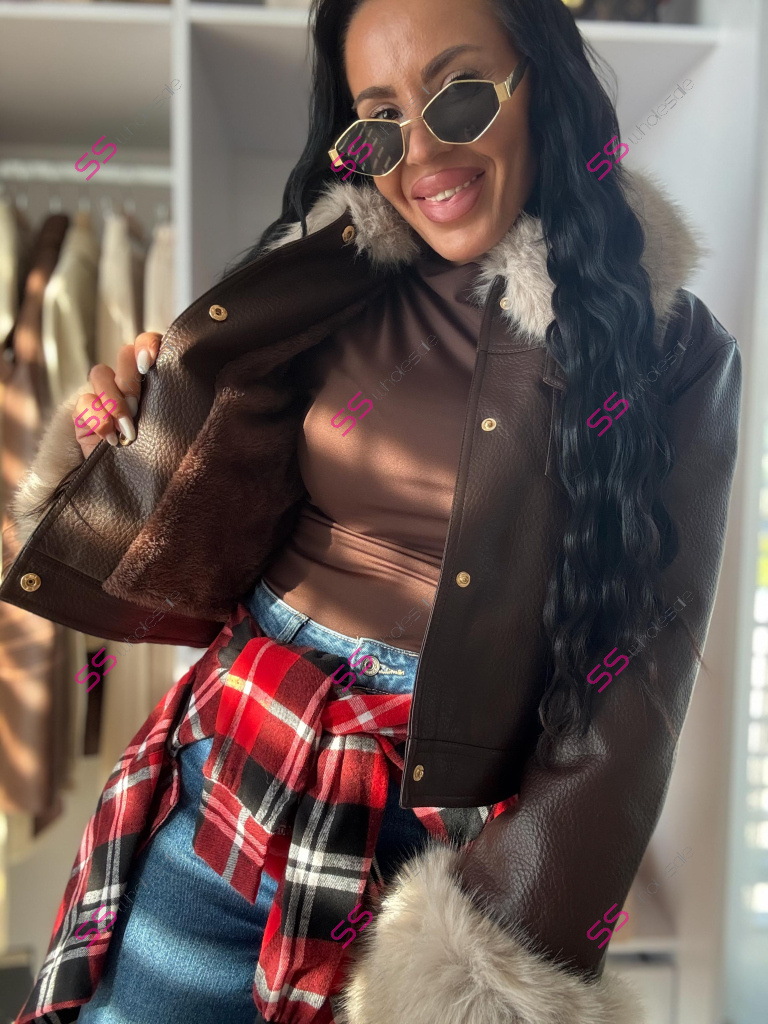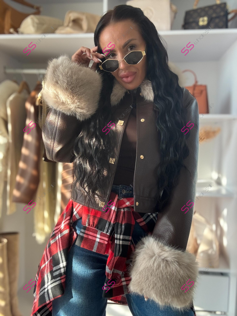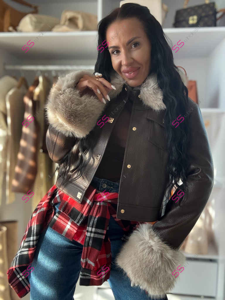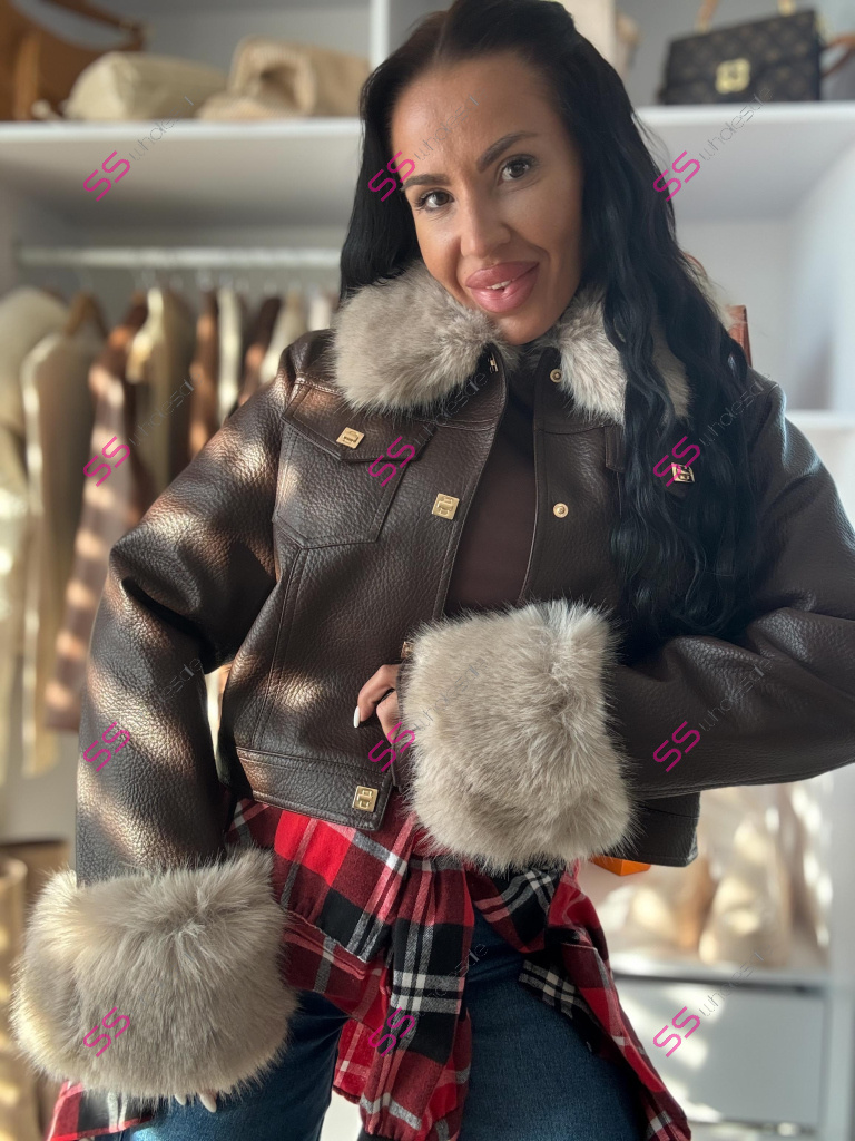 Kožená bunda s odnímateľným kožušinovým lemom na golieri a rukávoch. Podšitý mäkkým, príjemným kožúškom. Detaily sú v zlatej farbe. S bočnými vreckami.
