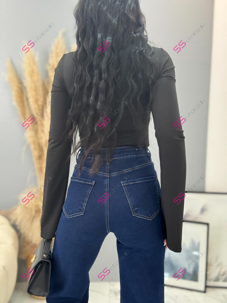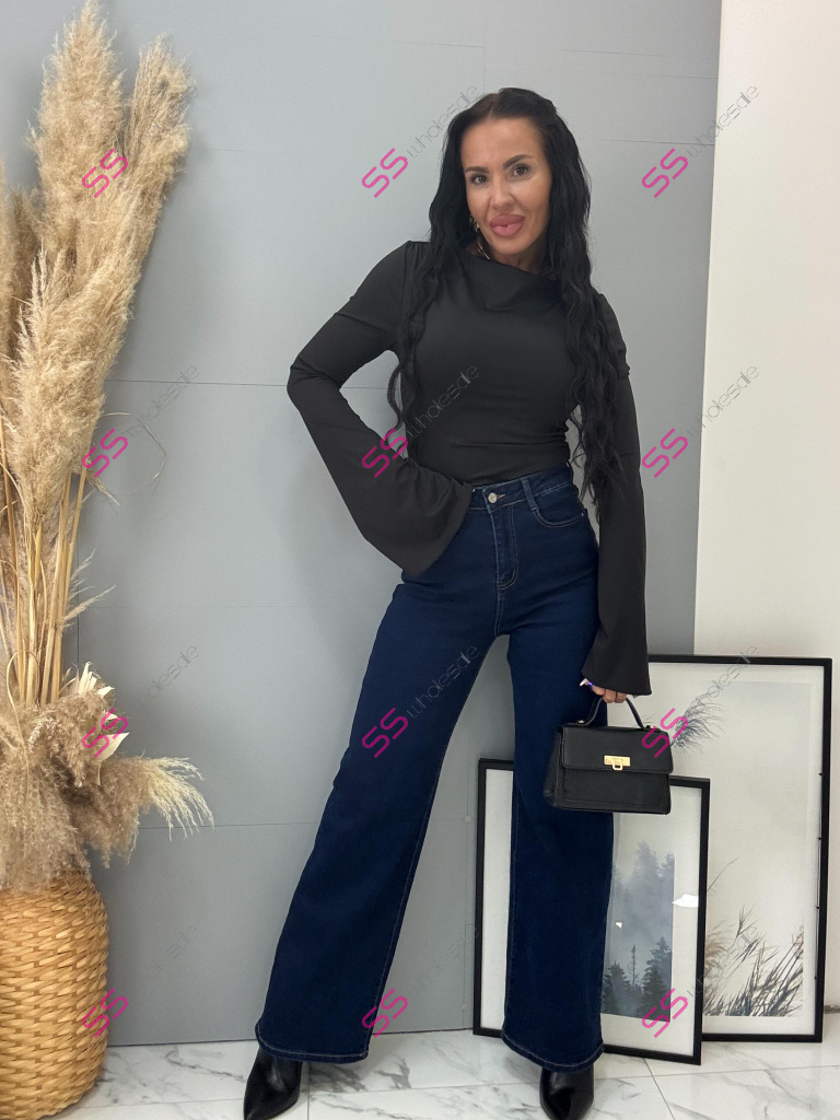 Džínsy wide leg, charakterizované širokými, rovnými nohavicami. Tento model s vysokým pásom je vyrobený z mierne elastickej látky. Gombík v strieborne farbe.