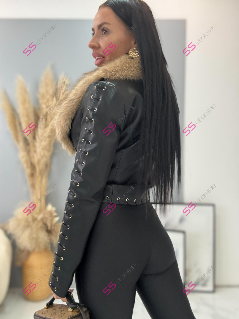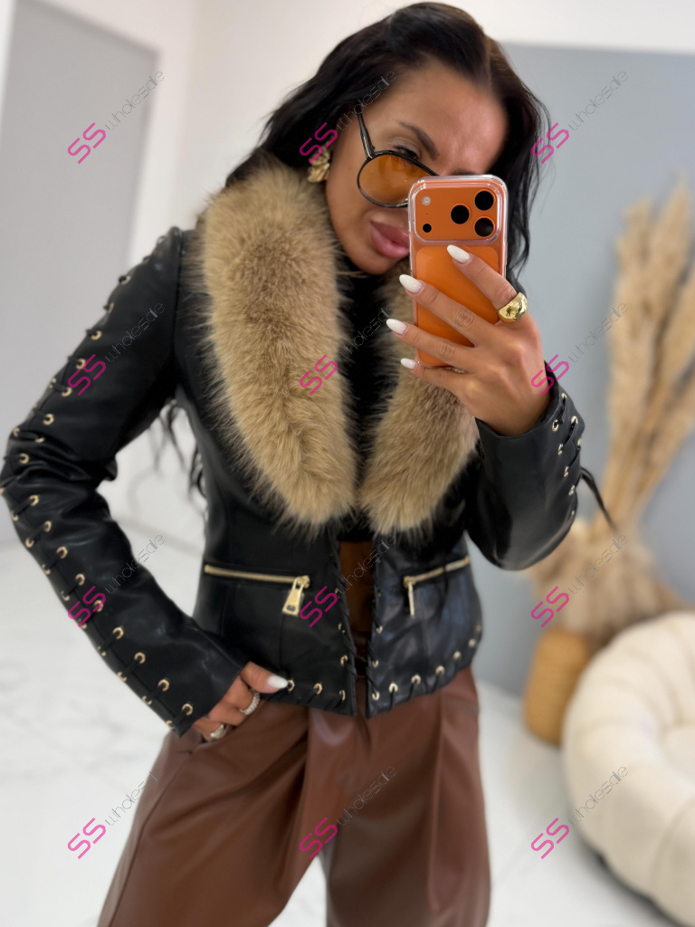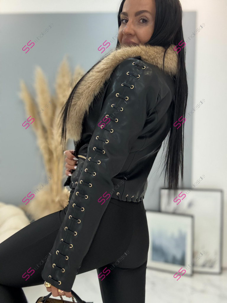 Kožená bunda s odnímateľným kožušinovým lemom na golieri. Detaily sú v zlatej farbe. Vreckami na prednej strane.