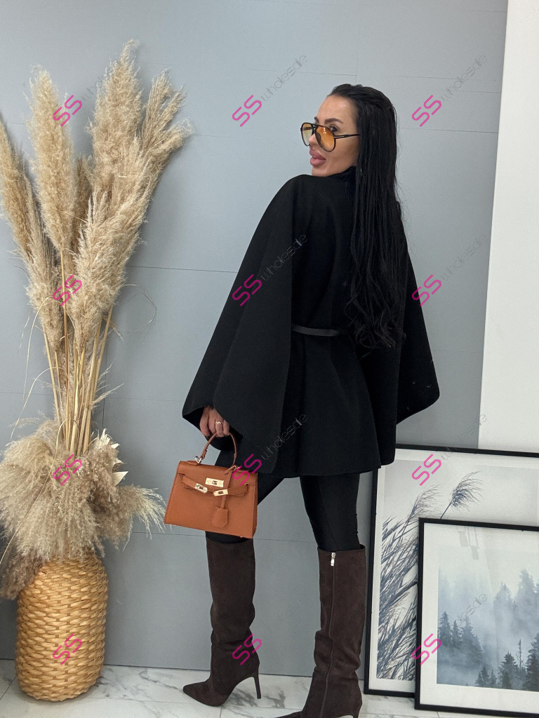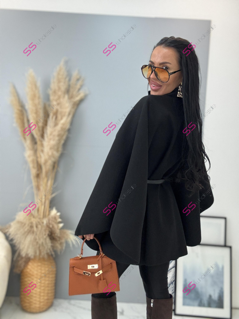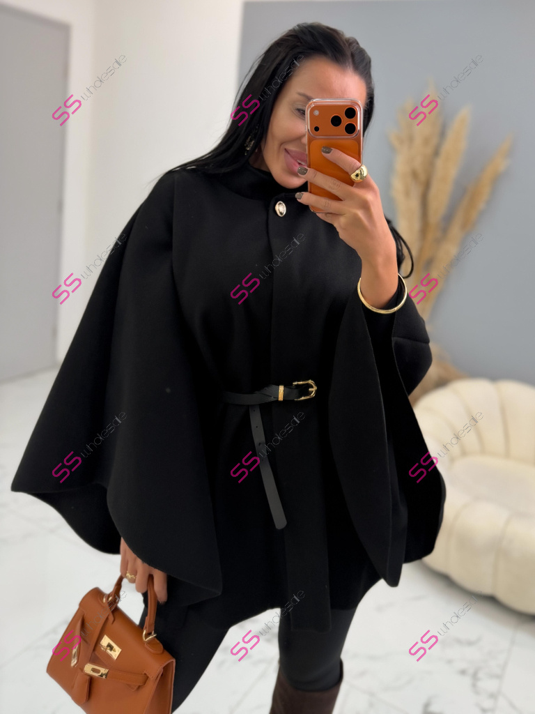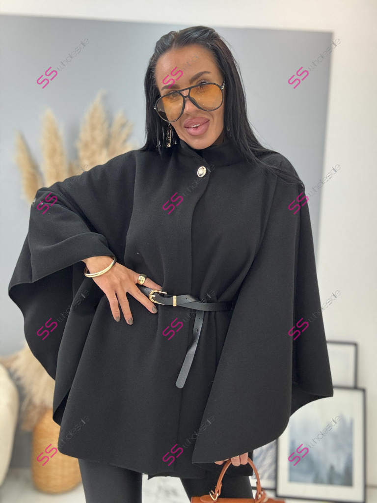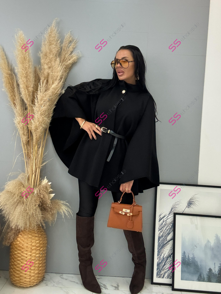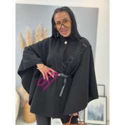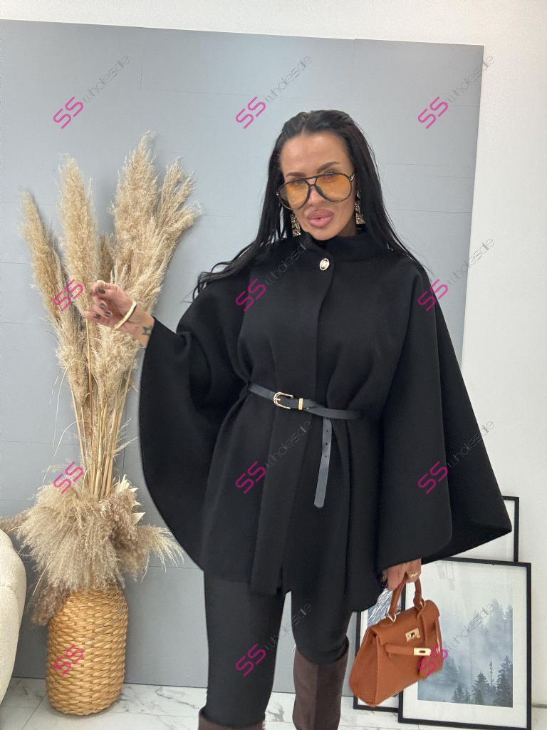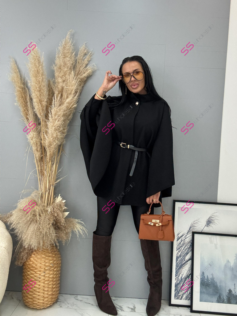 Premium kvalita.  Dámske asymetrické pončo doplnené moderným opaskom v čiernej farbe. Pončo je asymetrického strihu, vďaka ktorému pôsobí luxusne. Materiál nie je elastický. Kabát sa zapína na jeden zlatý gombík.