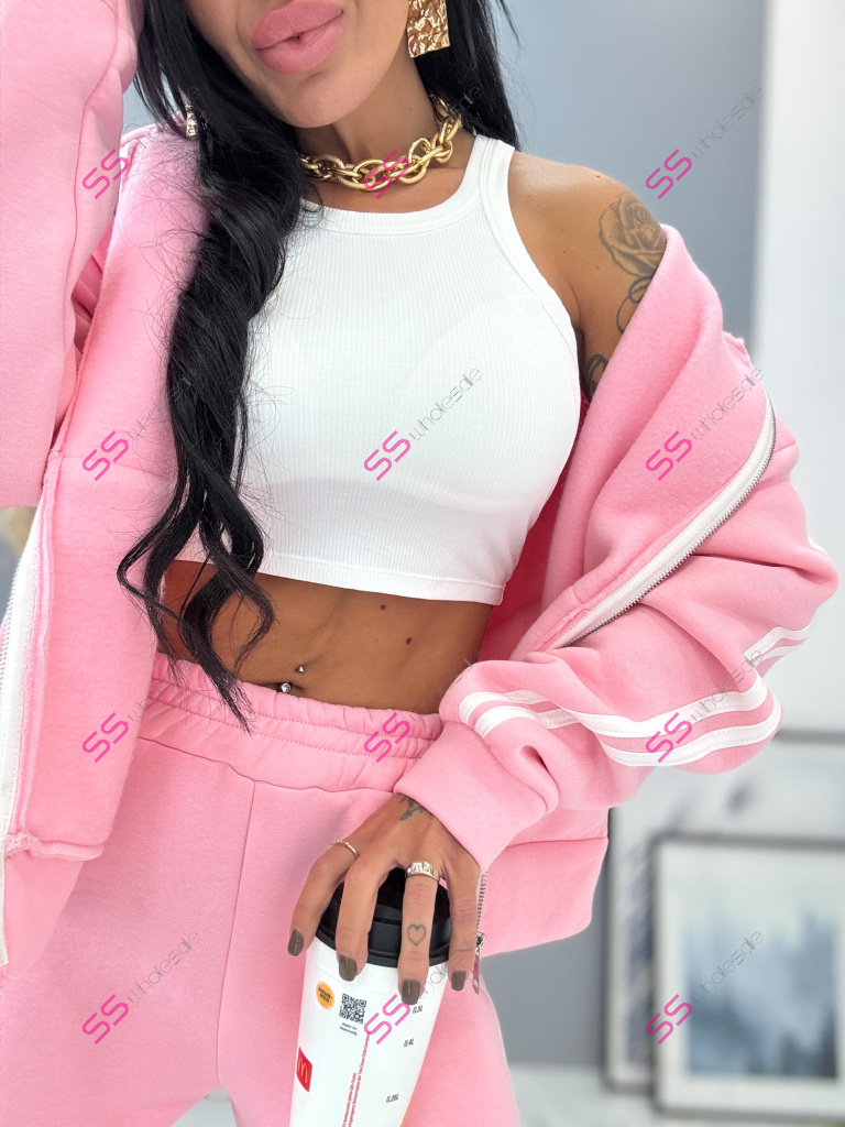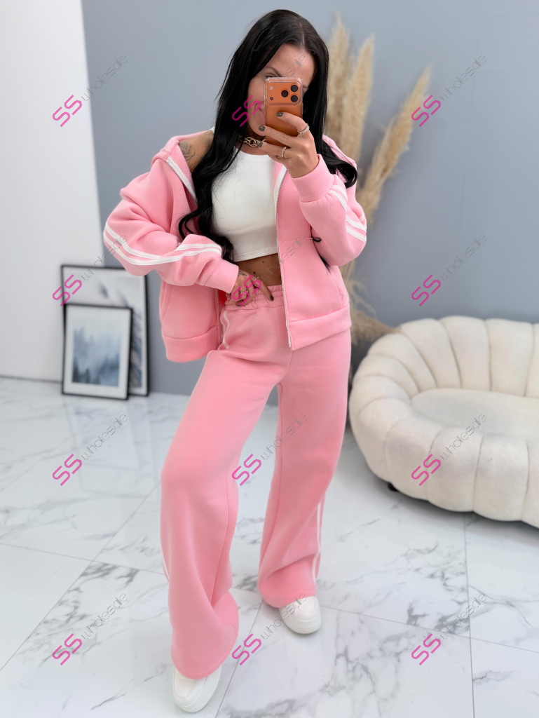 Dámsky komplet z novej kolekcie. Pozostáva z mikiny a nohavíc. Nohavice majú gumený pás Materiál je príjemný, zateplený, elastický. Mikina so striborným zipsom a vreckami na prednej strane.