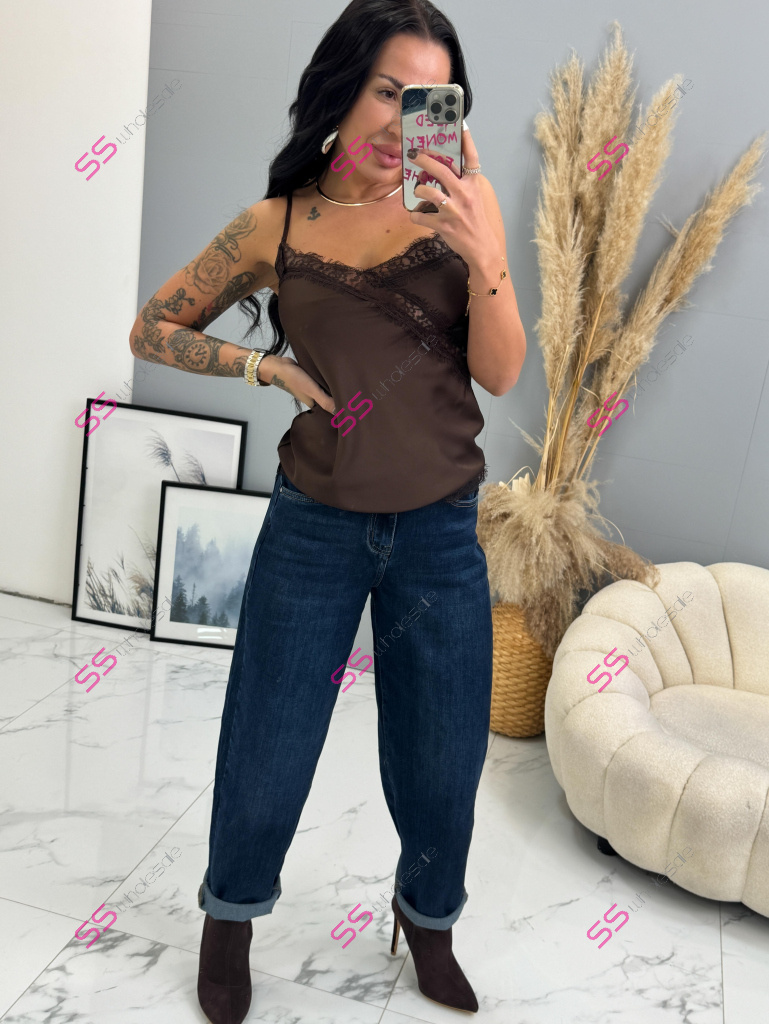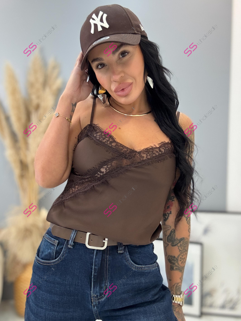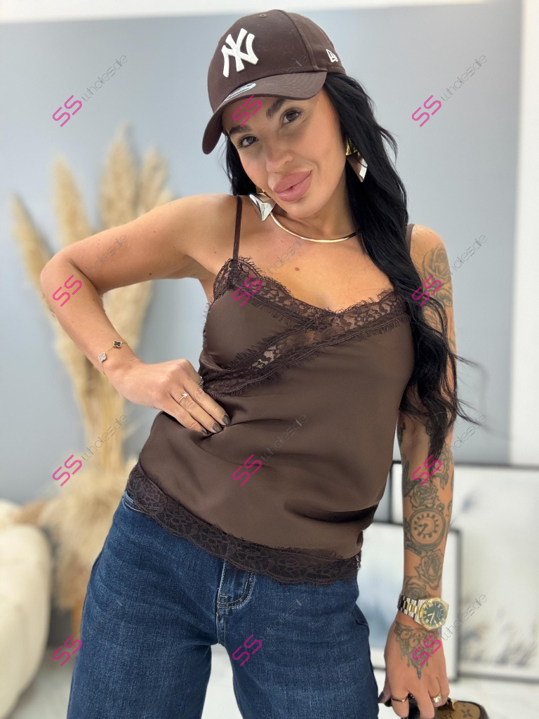 Elegantný saténový top s jemnou čipkou a nastaviteľnými tenkými ramienkami.