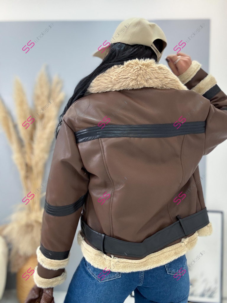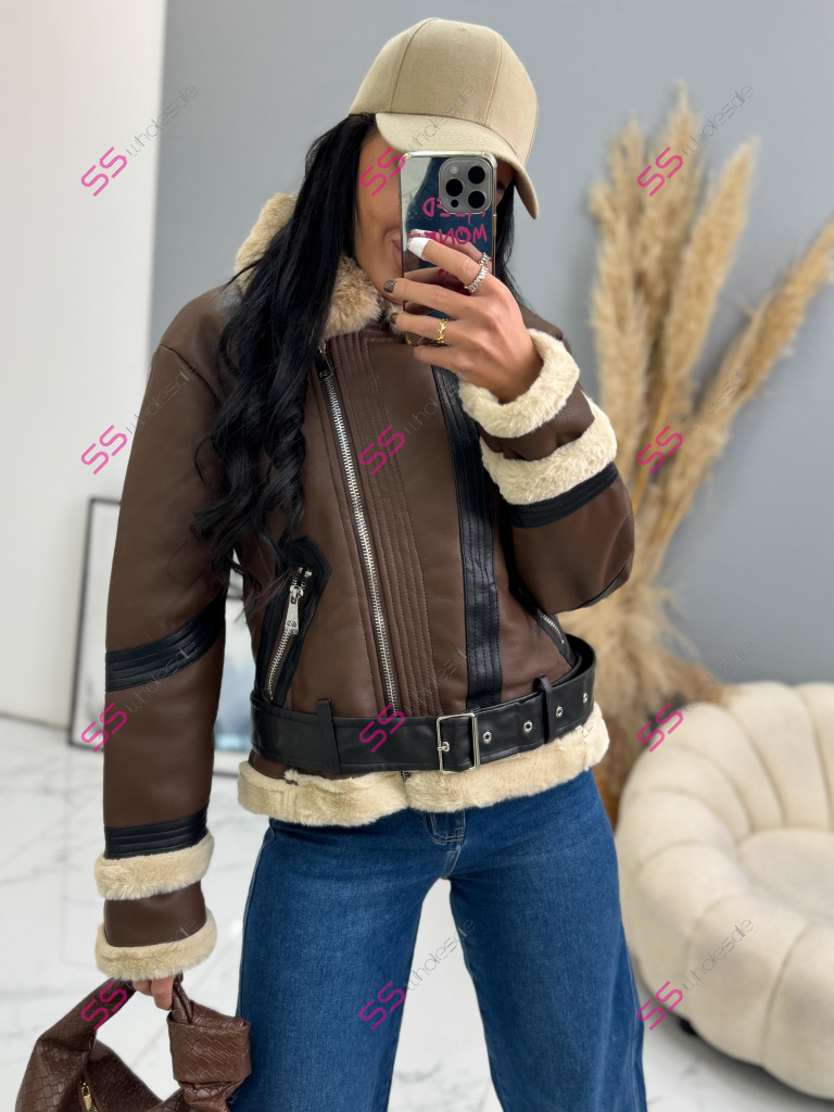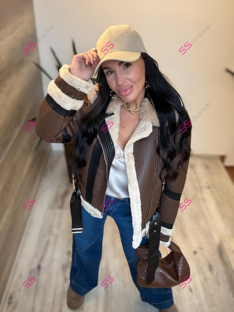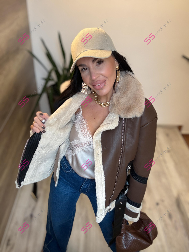 Kožená bunda s neodnímateľným kožušinovým lemom na golieri a rukávoch. Podšitý mäkkým, príjemným kožúškom. Detaily sú v stribornej farbe. S bočnými vreckami.