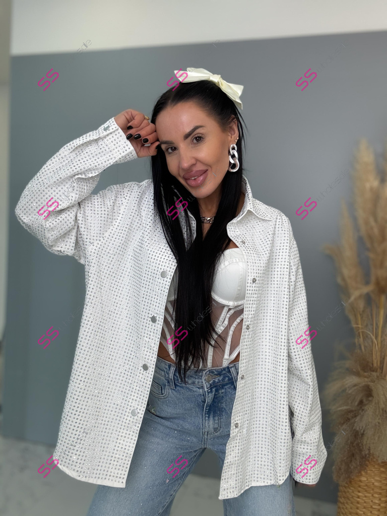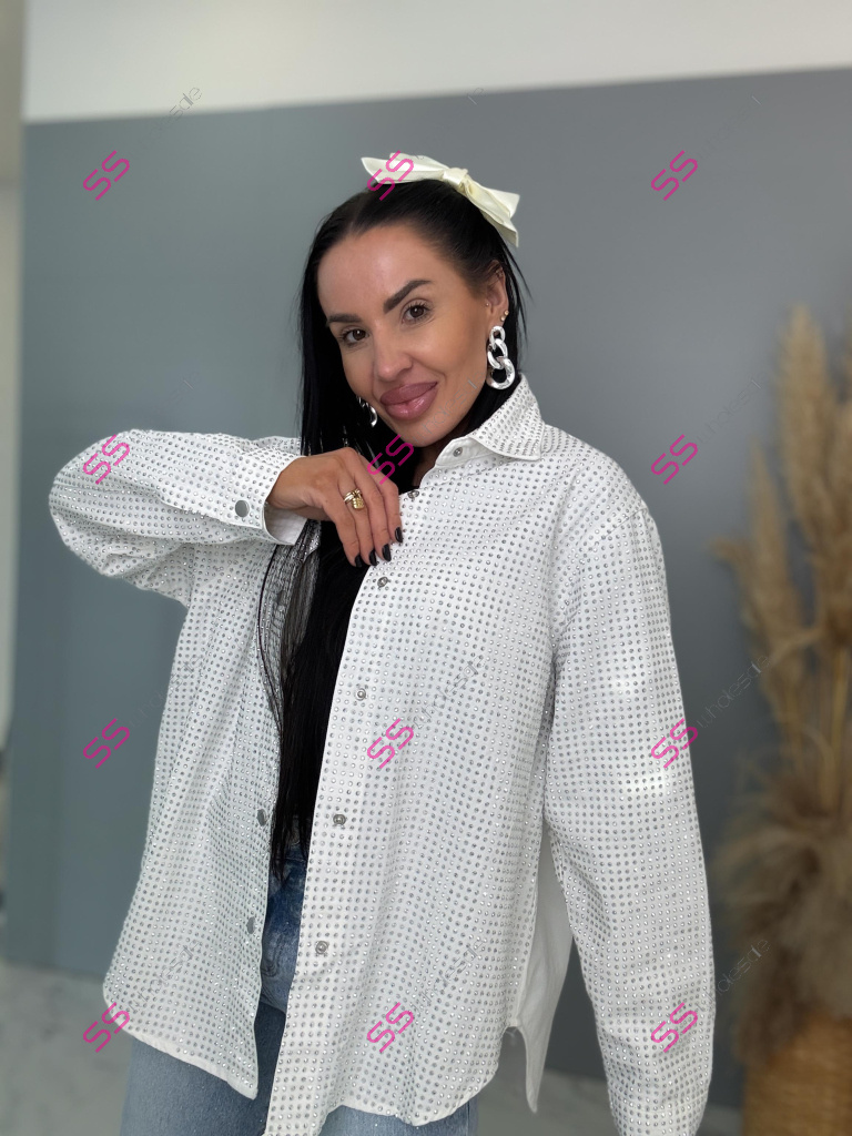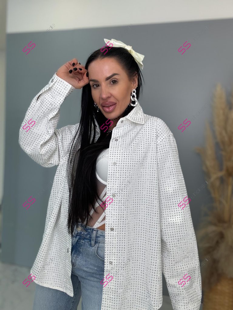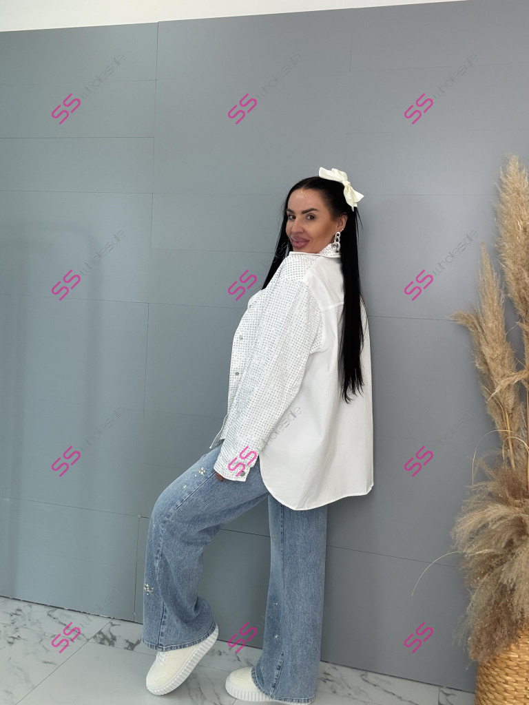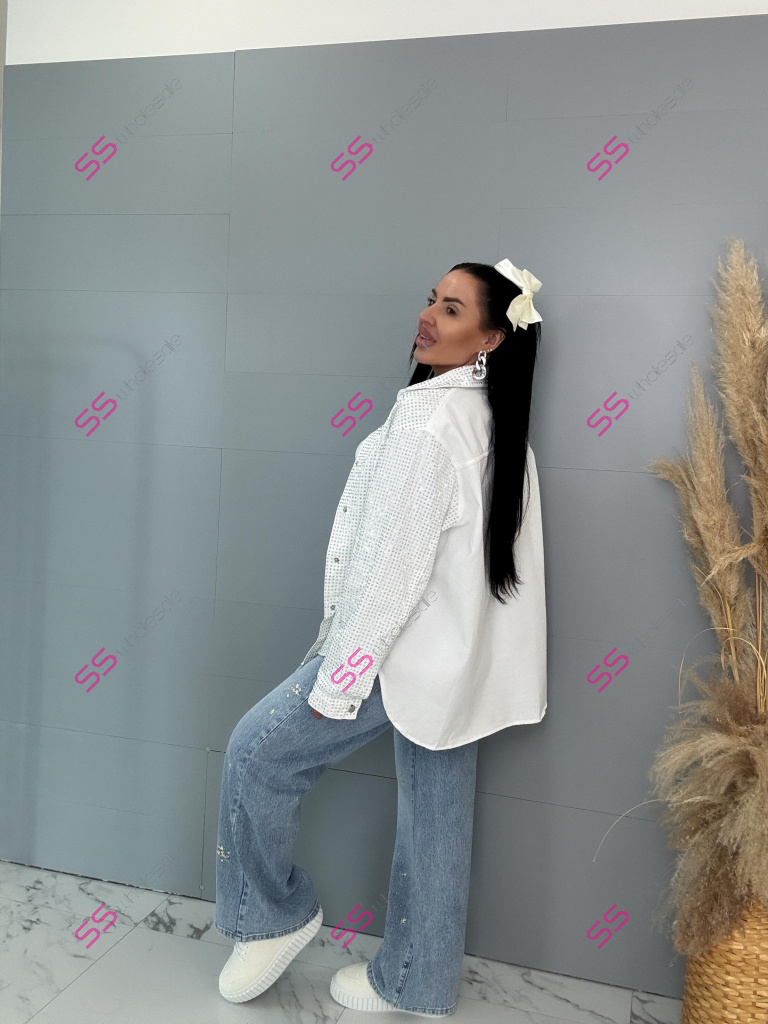 Dámska denim košeľa s ozdobnými kamienkami. Materiál nie je elastický. Zapínania na spony sú striebornej farby.