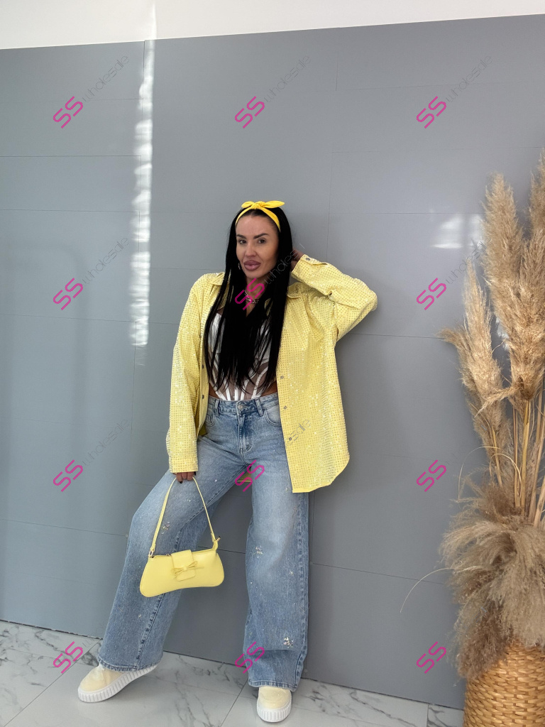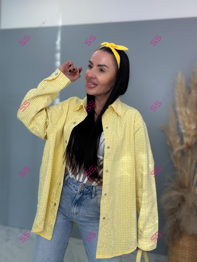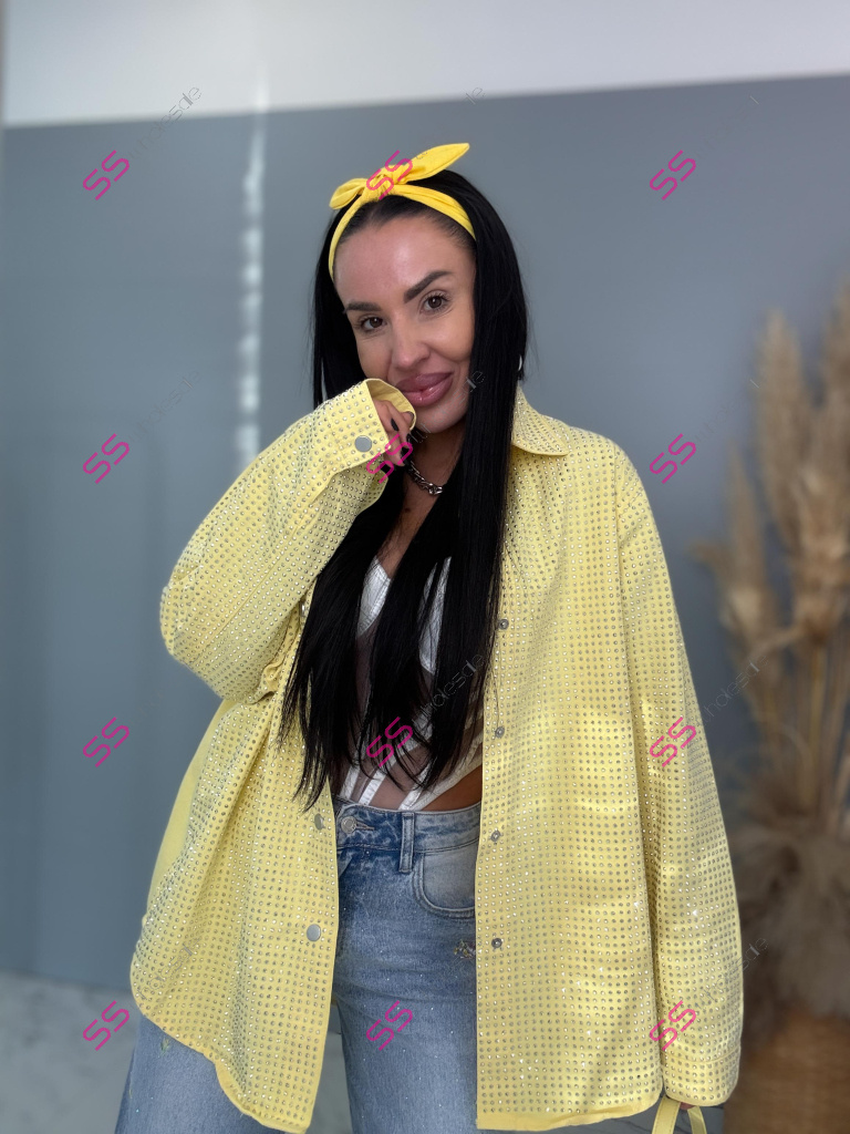 Dámska denim košeľa s ozdobnými kamienkami. Materiál nie je elastický. Zapínania na spony sú striebornej farby.