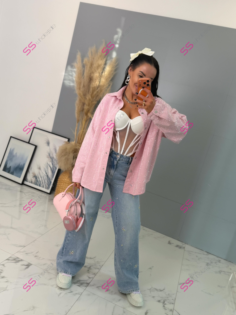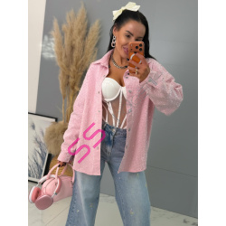 Dámska denim košeľa s ozdobnými kamienkami. Materiál nie je elastický. Zapínania na spony sú striebornej farby.