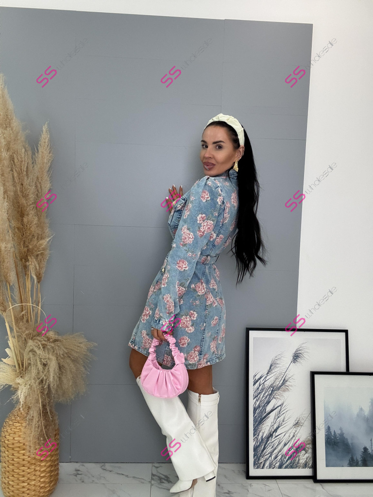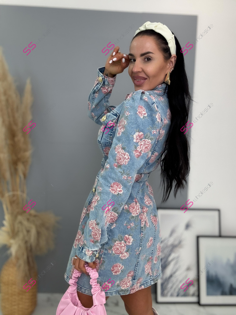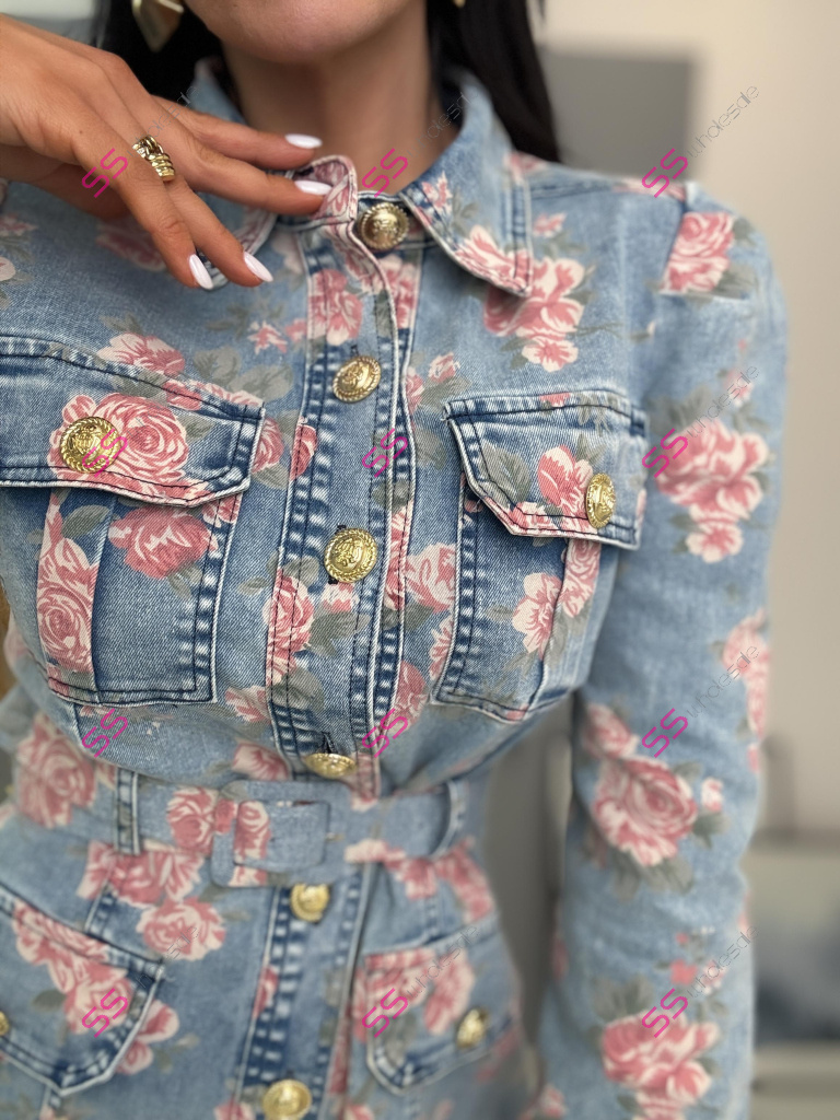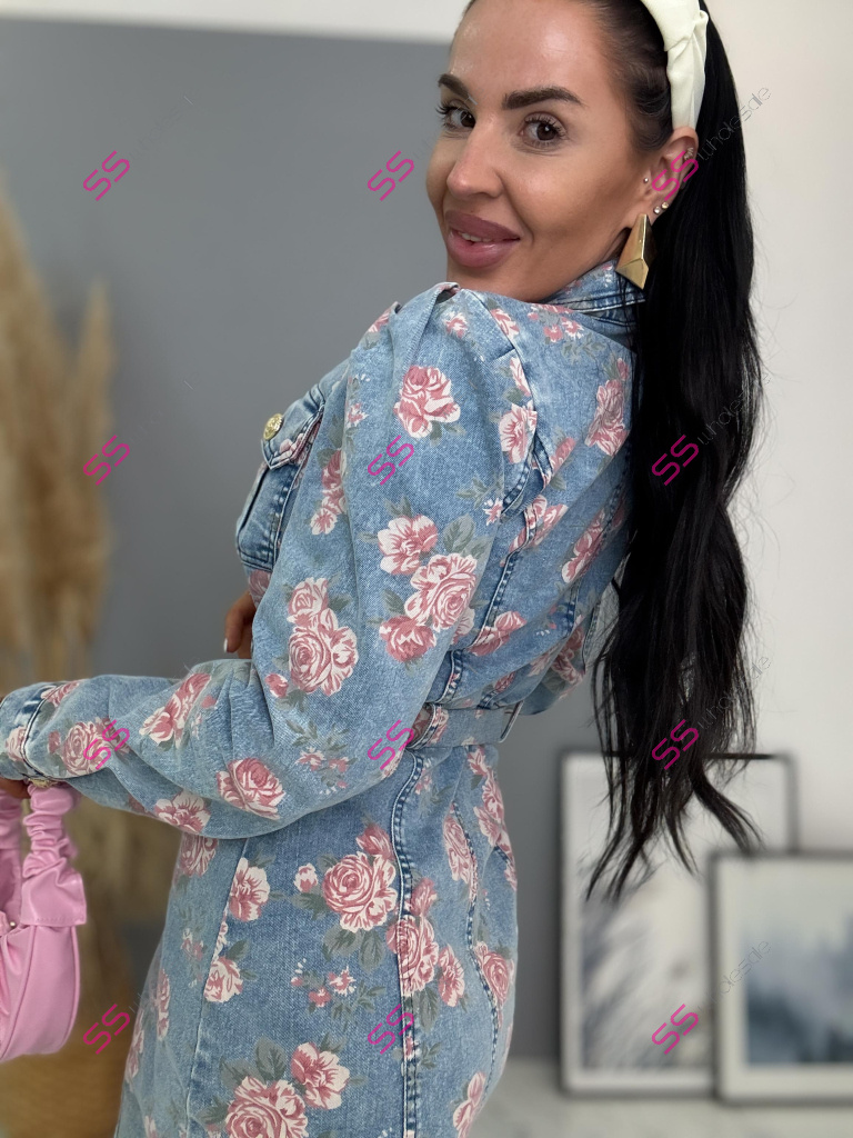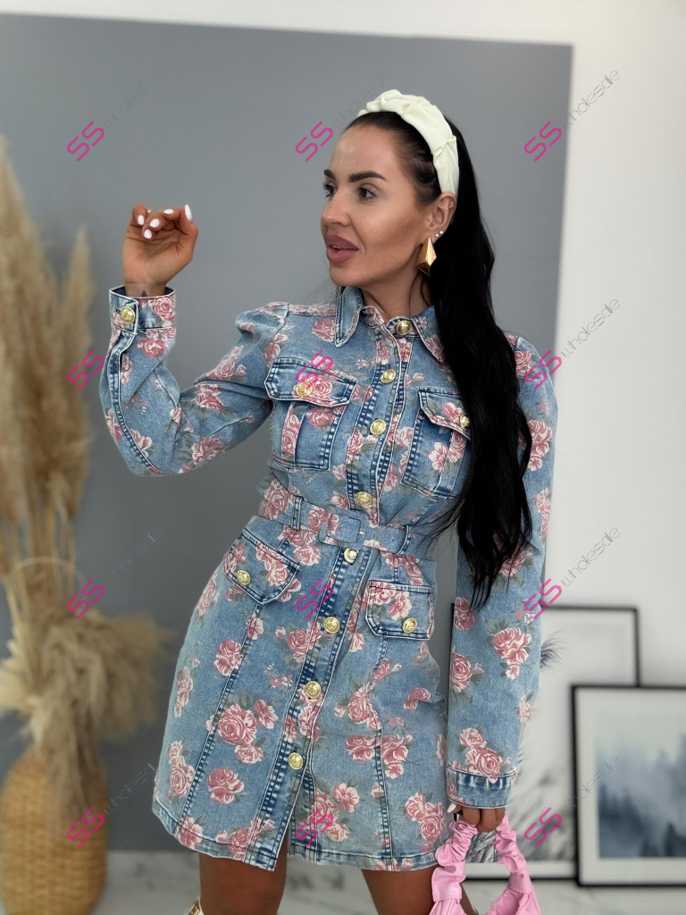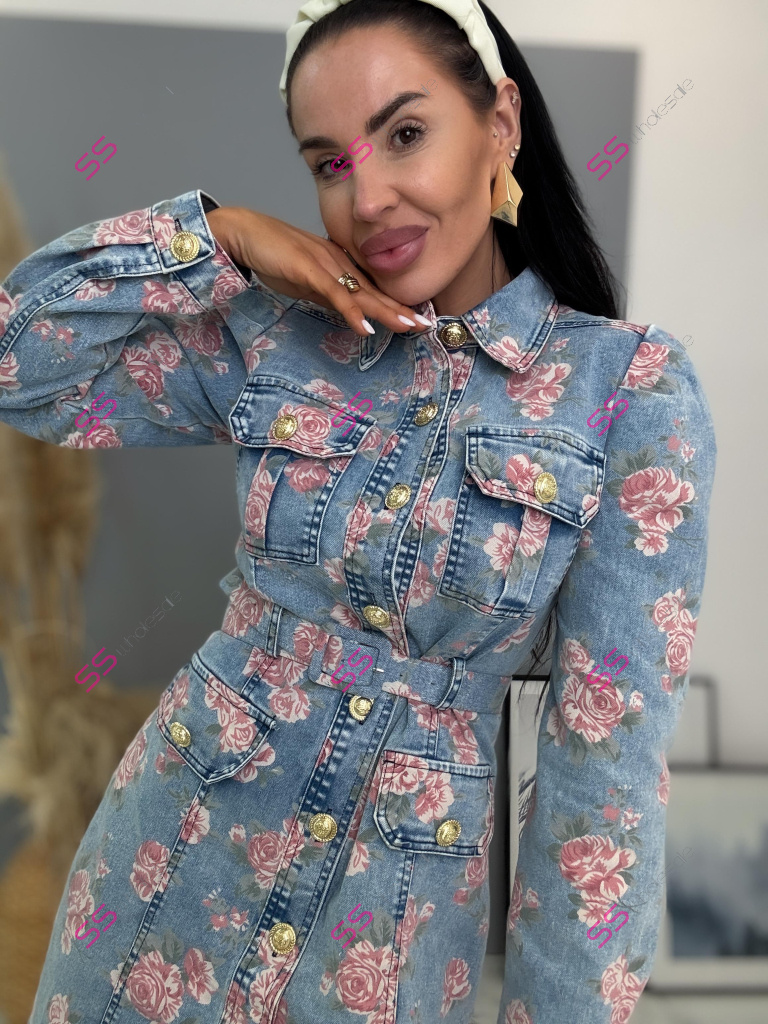 Kvetované rifľové šaty so zlatými gombíkmi a opaskom. Materiál je mierne elastický.