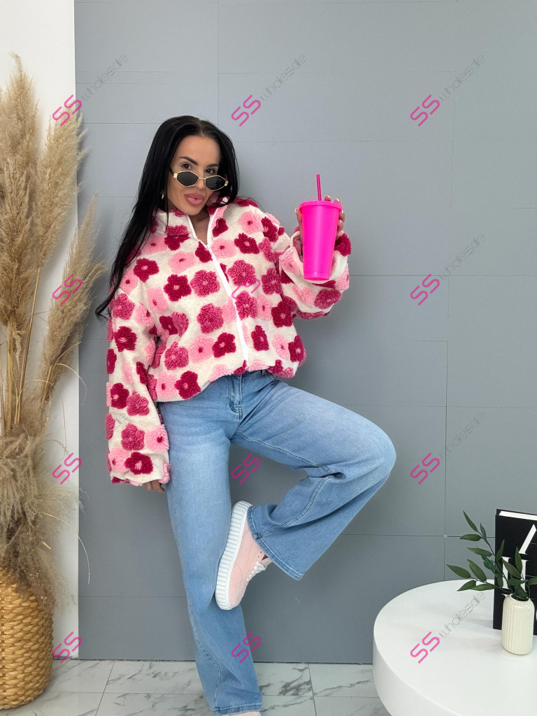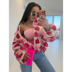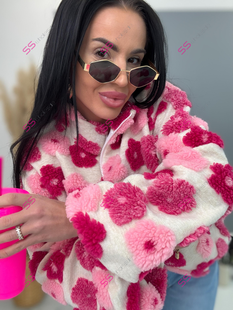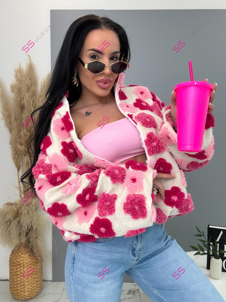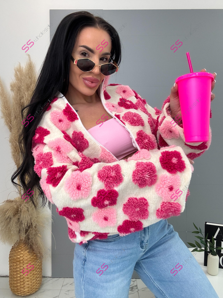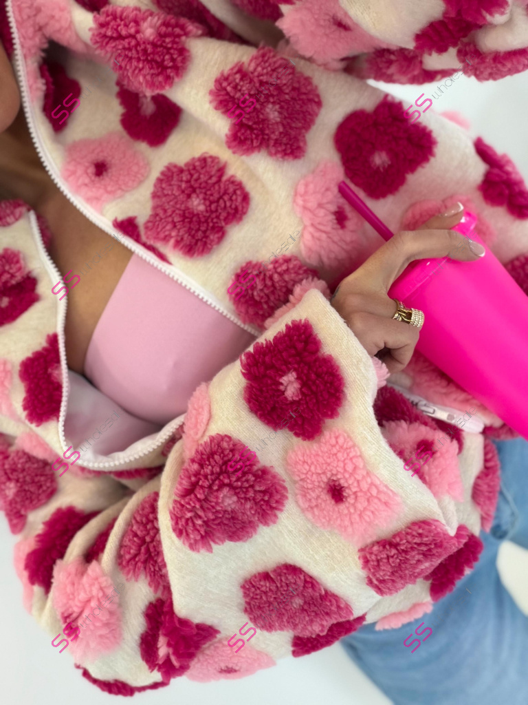 Kabát je vyrobený z príjemného materiálu. Model vyniká plyšovými aplikáciami v tvare kvetu. Oversize prevedenie so stojačikom a podšívkou. Zapína sa na zips. Bočnými vreckami.