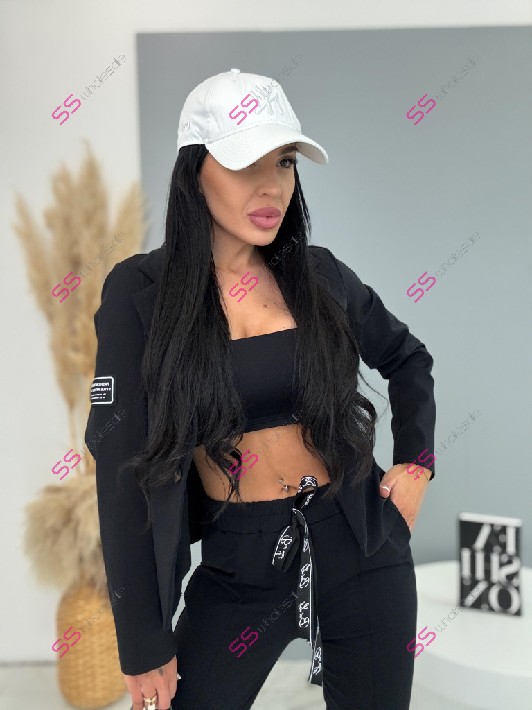 Teplákový oblek je ideálnou voľbou pre moderné ženy. Pozostáva zo saka a nohavíc. Materiál je príjemný a elastický. Ľahké sako sa zapína na gombík a na jednom z rukávov sa nachádza nášivka. Látkové nohavice majú bočné vrecká a gumený pás.